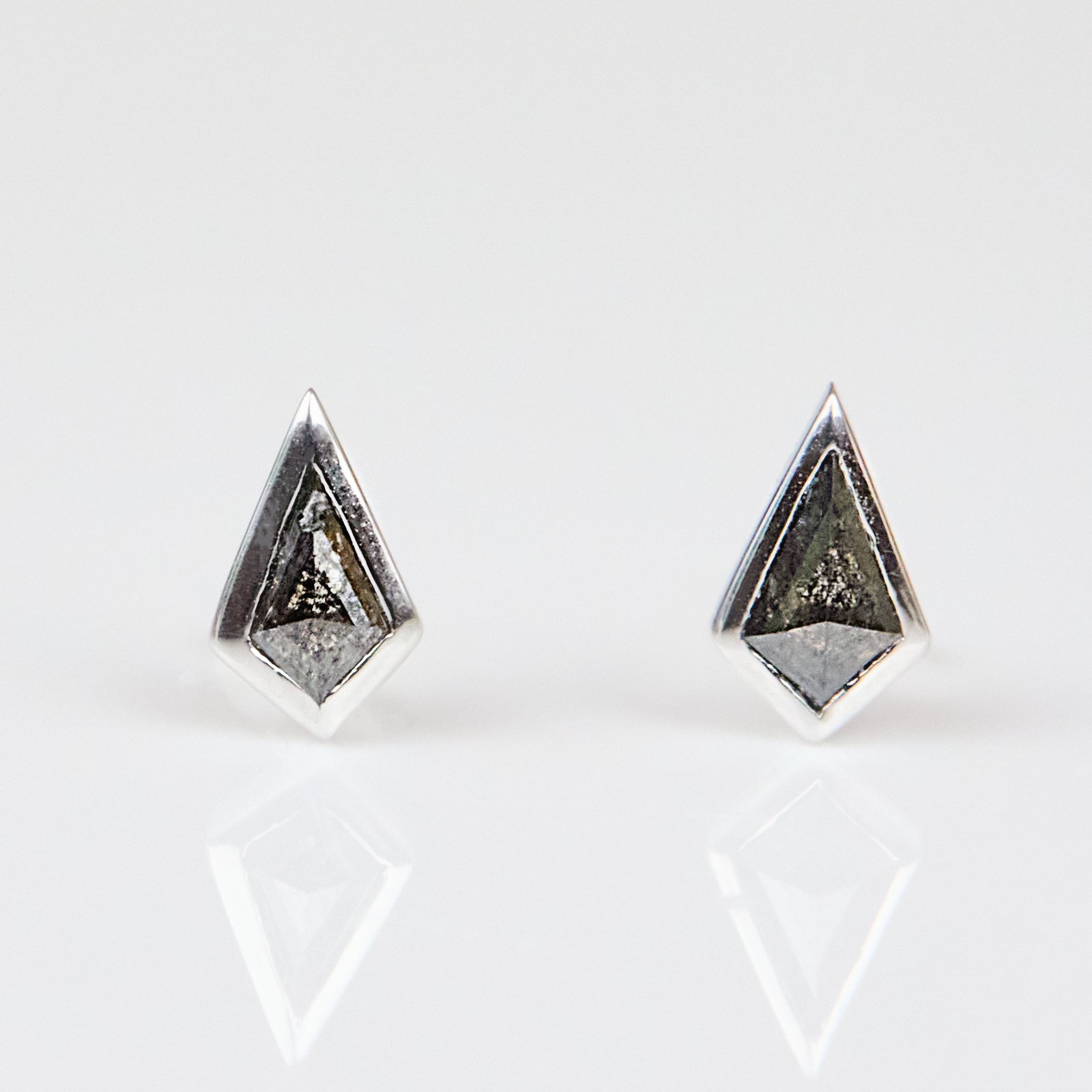Petite dark and stormy salt and pepper diamond kite studs in our signature platinum setting. Minimally luxurious earrings to wear now and forever.