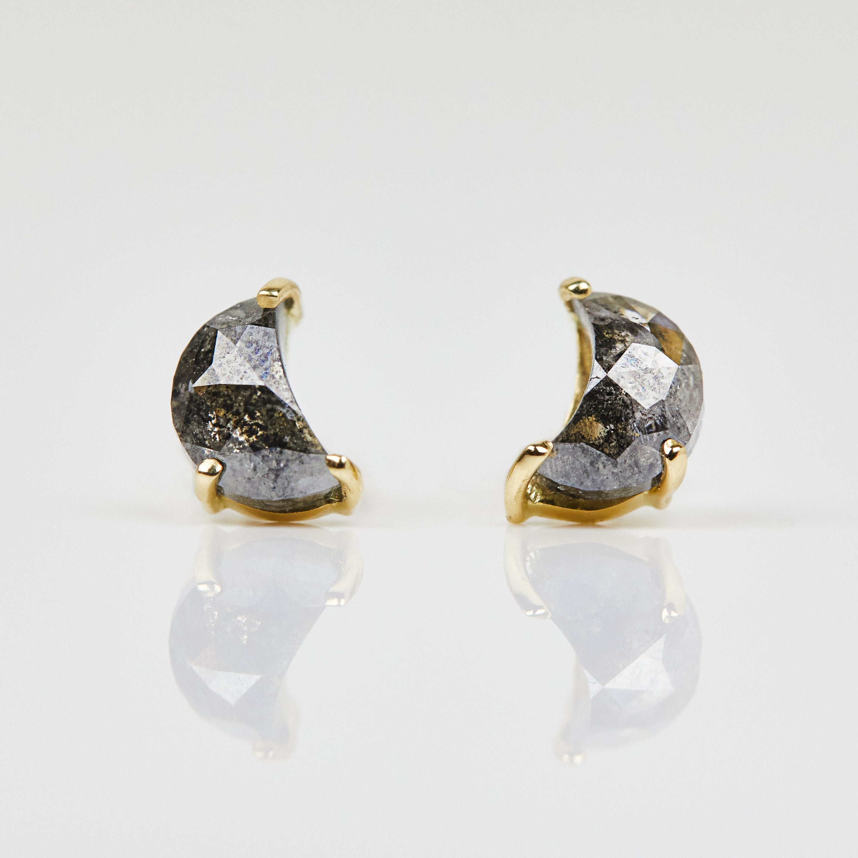 Delicately curved dark and stormy diamond studs in an alternative rose cut crescent moon shape. Set with ethically sourced salt and pepper diamonds handpicked by Sophia.