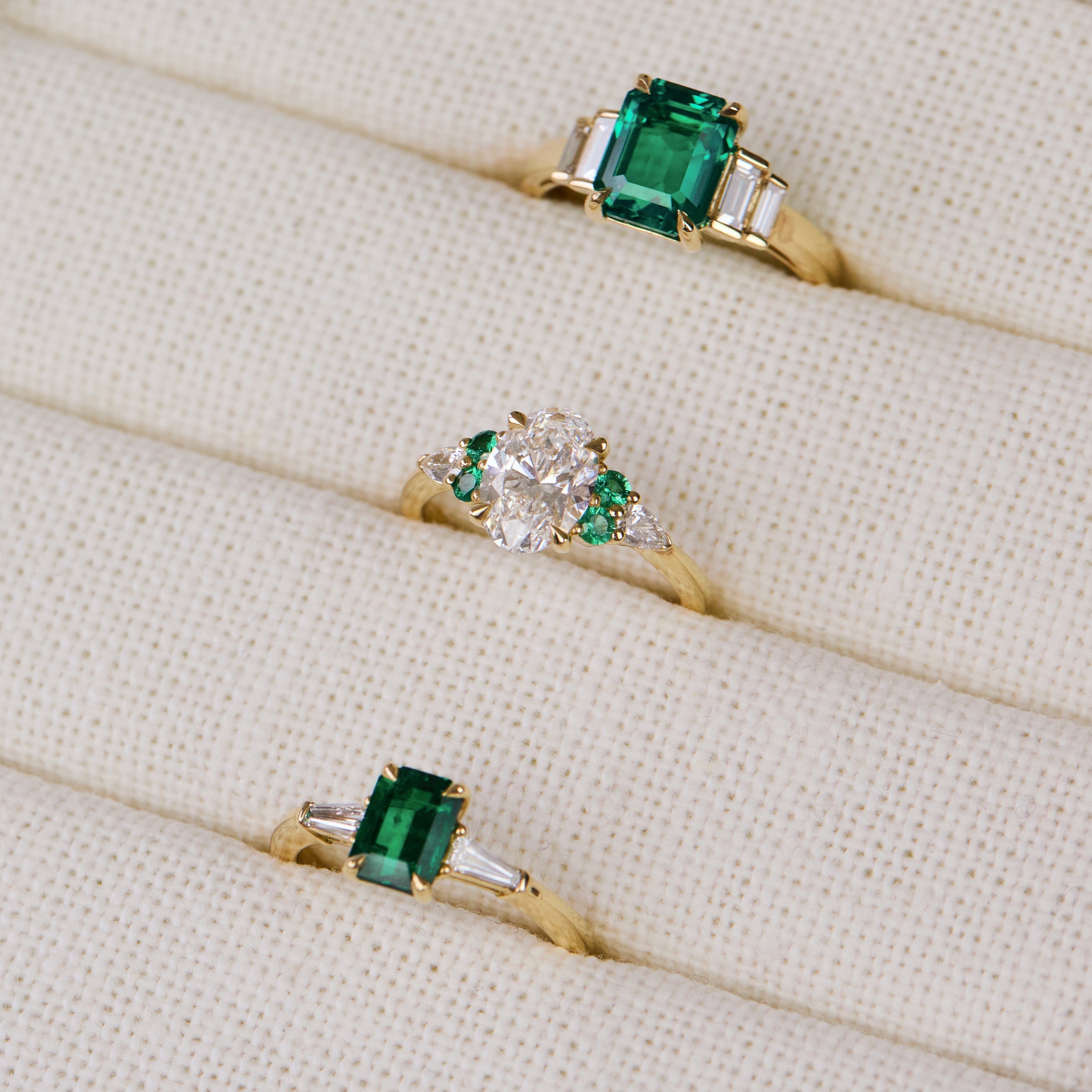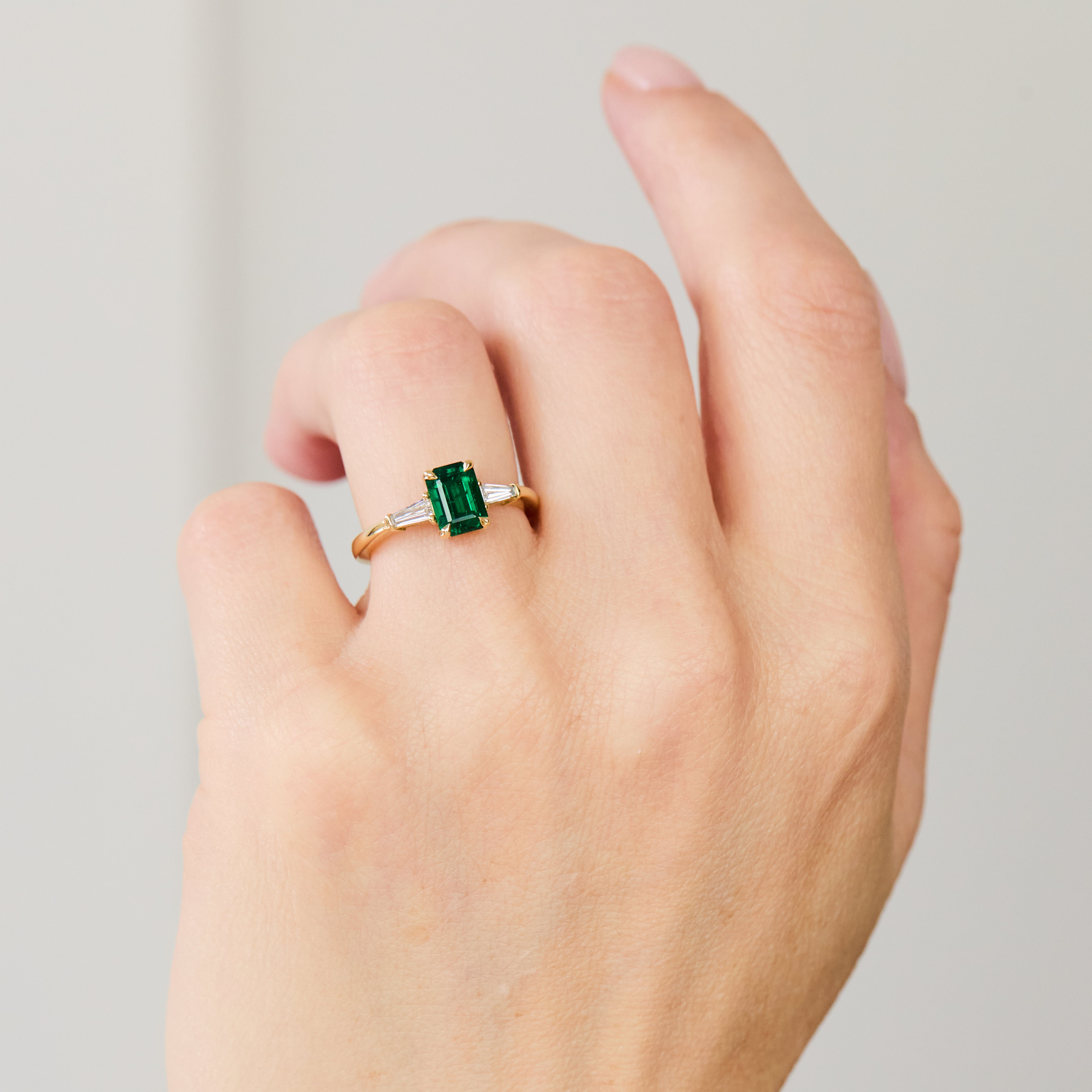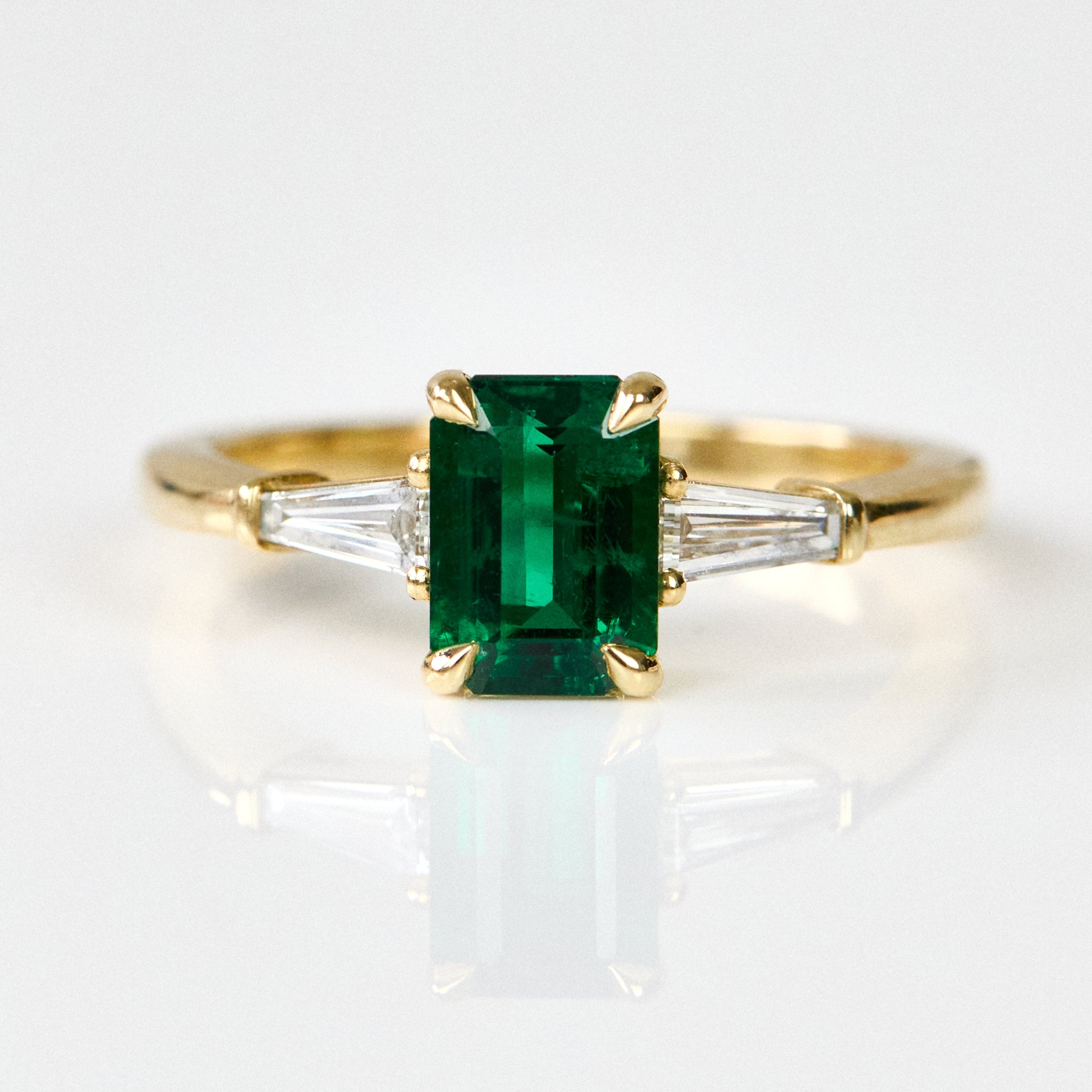 This Zambian emerald was handpicked for its vivid green hue, a striking testament to nature's beauty. Tapered baguette side diamonds add a touch of art deco style, framing the centre stone beautifully. Perfect for those who prefer subtle designs full of charm and character.