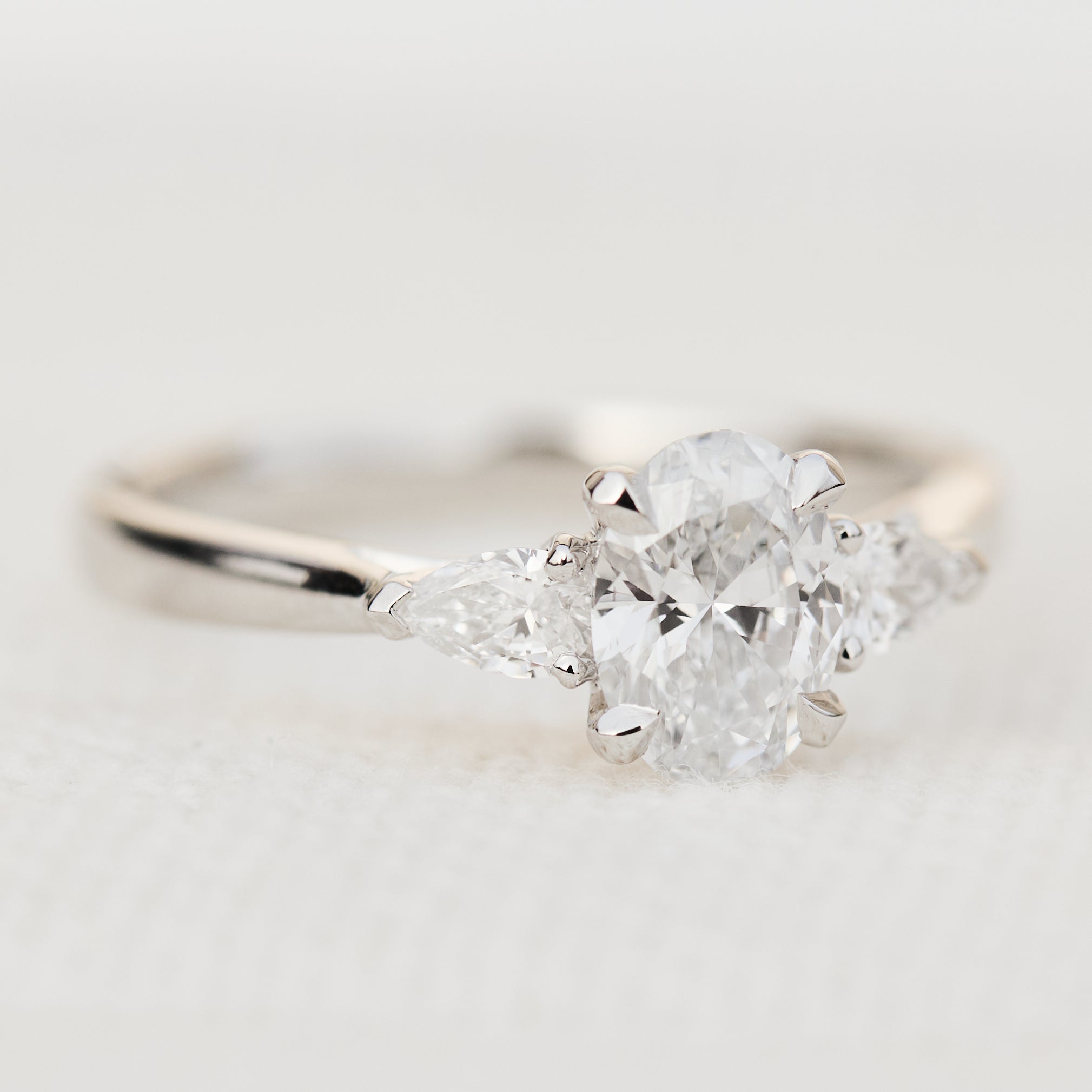 The Luna ring is an SPJ favourite. This engagement ring features a stunning lab-grown oval diamond, complemented by two pear-shaped side diamonds. Handcrafted in 18ct yellow gold, it is elegant simplicity at its best.