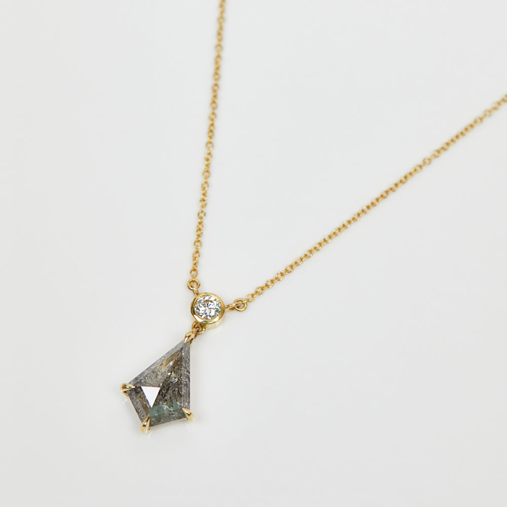 This salt and pepper necklace features a gorgeous kite shape diamond set in 18ct yellow gold with a round diamond. An easy-to-wear piece with a unique flair, for those looking for a more alternative to a classic diamond pendant: this necklace will be a future staple in your jewellery collection.