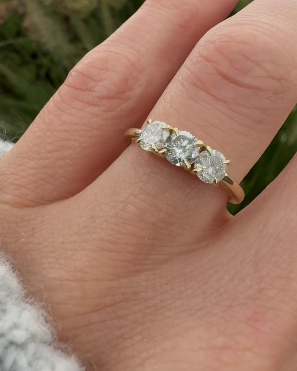 One of our favourite designs, this round brilliant cut salt and pepper diamond engagement ring is complemented by matching round cut side diamonds, set in 18ct yellow gold. Its timeless, elegant design is perfect for those seeking a simple yet striking ring with subtle charm.