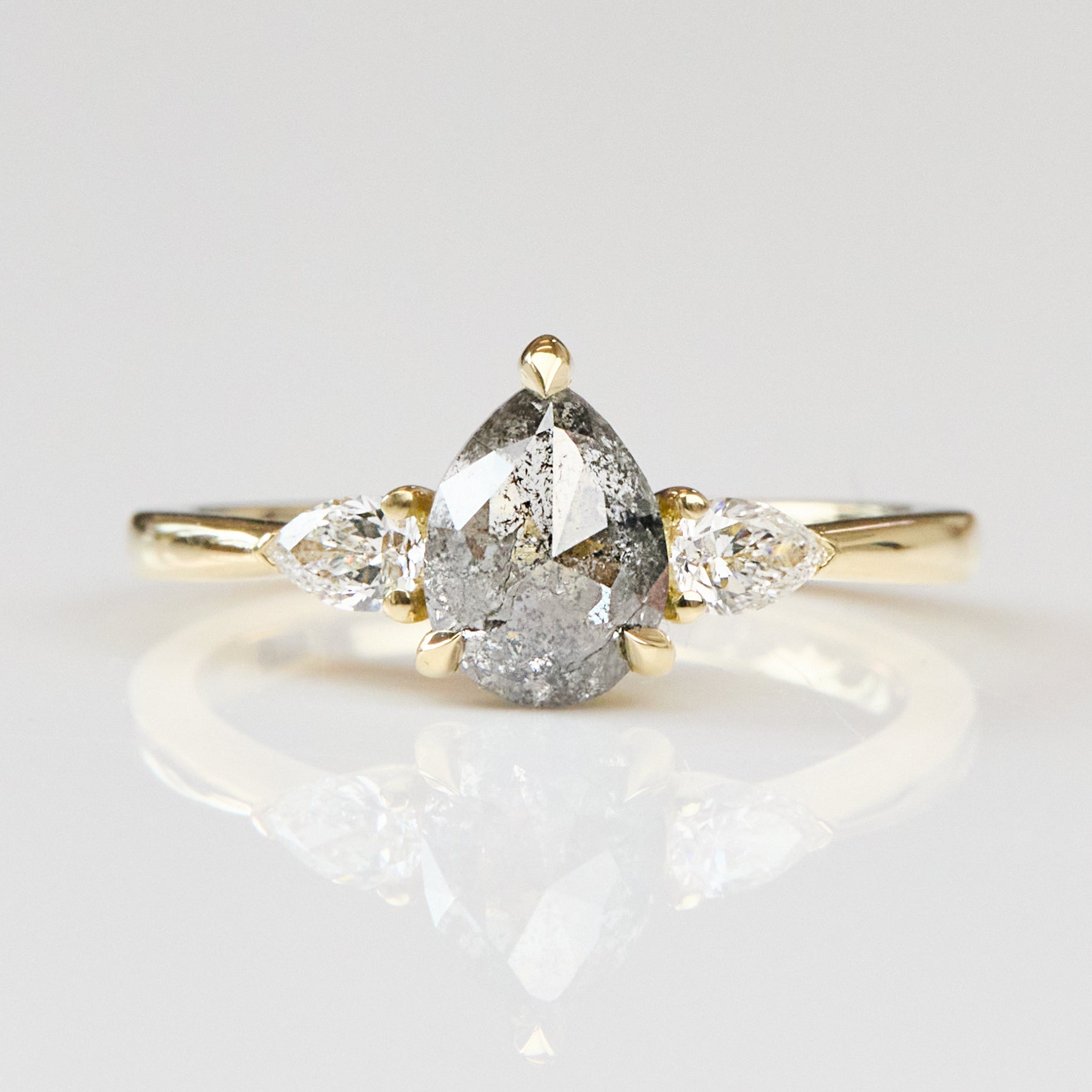 The Luna Ring features a stunning natural pear shape salt and pepper diamond, complemented by a pair of matching pear shape side diamonds. Set in 18ct yellow gold, its sleek, modern design is elevated by the unique trilogy setting, making it a striking and timeless choice for an engagement ring.