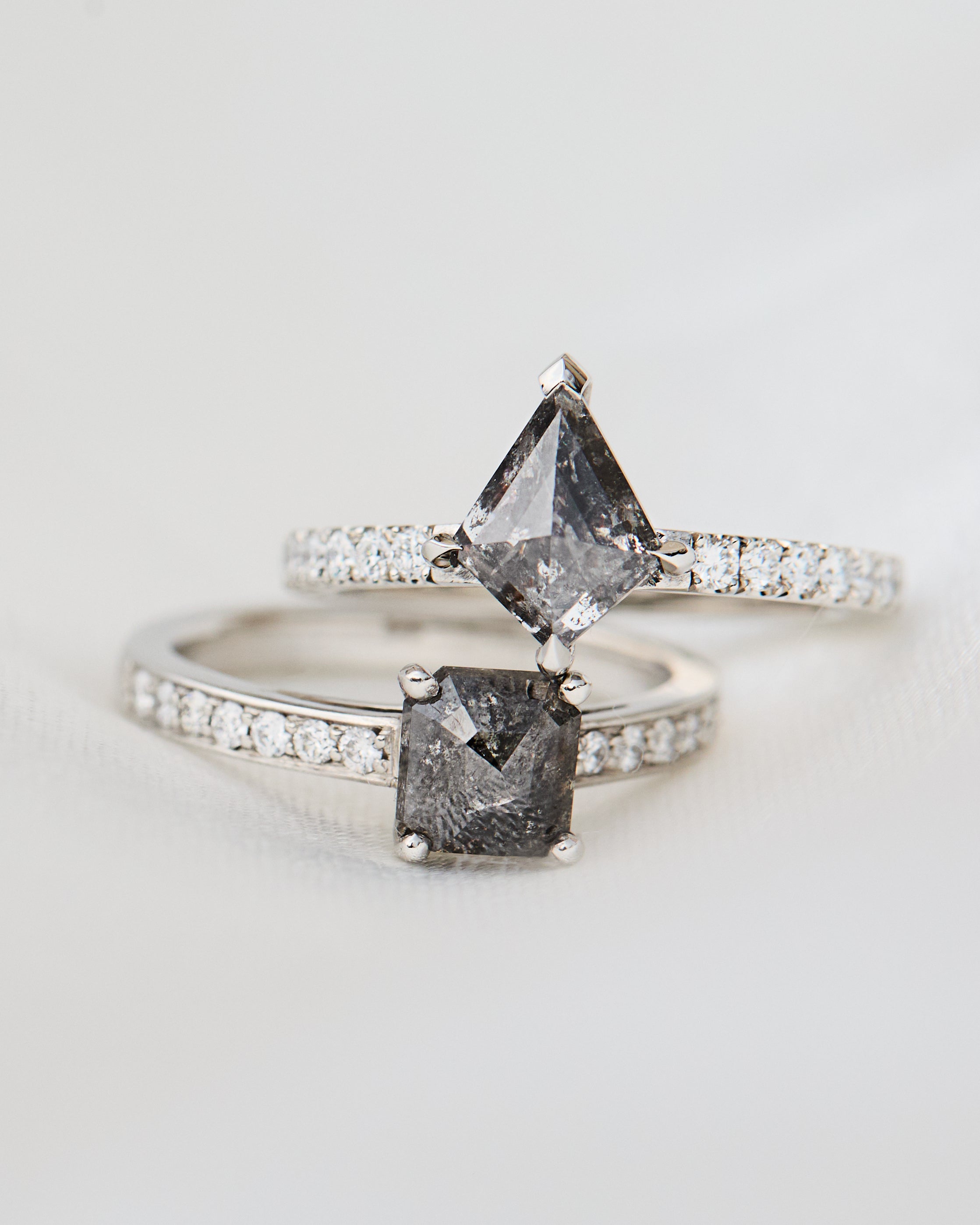 Proof that minimal needn’t be boring, the Athena engagement ring features a striking kite-shaped salt and pepper diamond, accented by diamond pavé shoulders. Set in platinum, it’s a bold yet refined design.