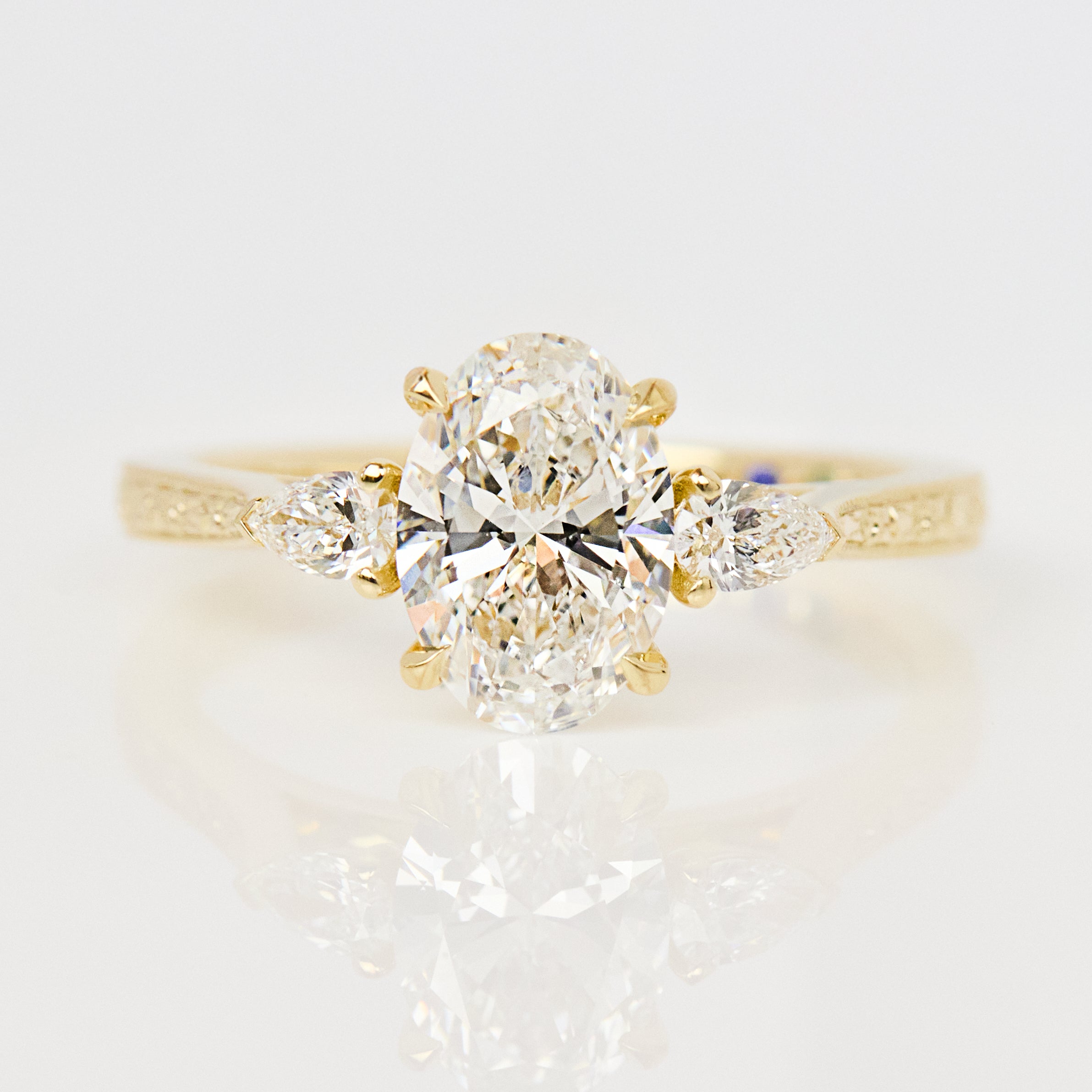 The Luna ring is an SPJ favourite. This engagement ring features a stunning lab-grown oval diamond, complemented by two pear-shaped side diamonds. Handcrafted in 18ct yellow gold, it is elegant simplicity at its best.