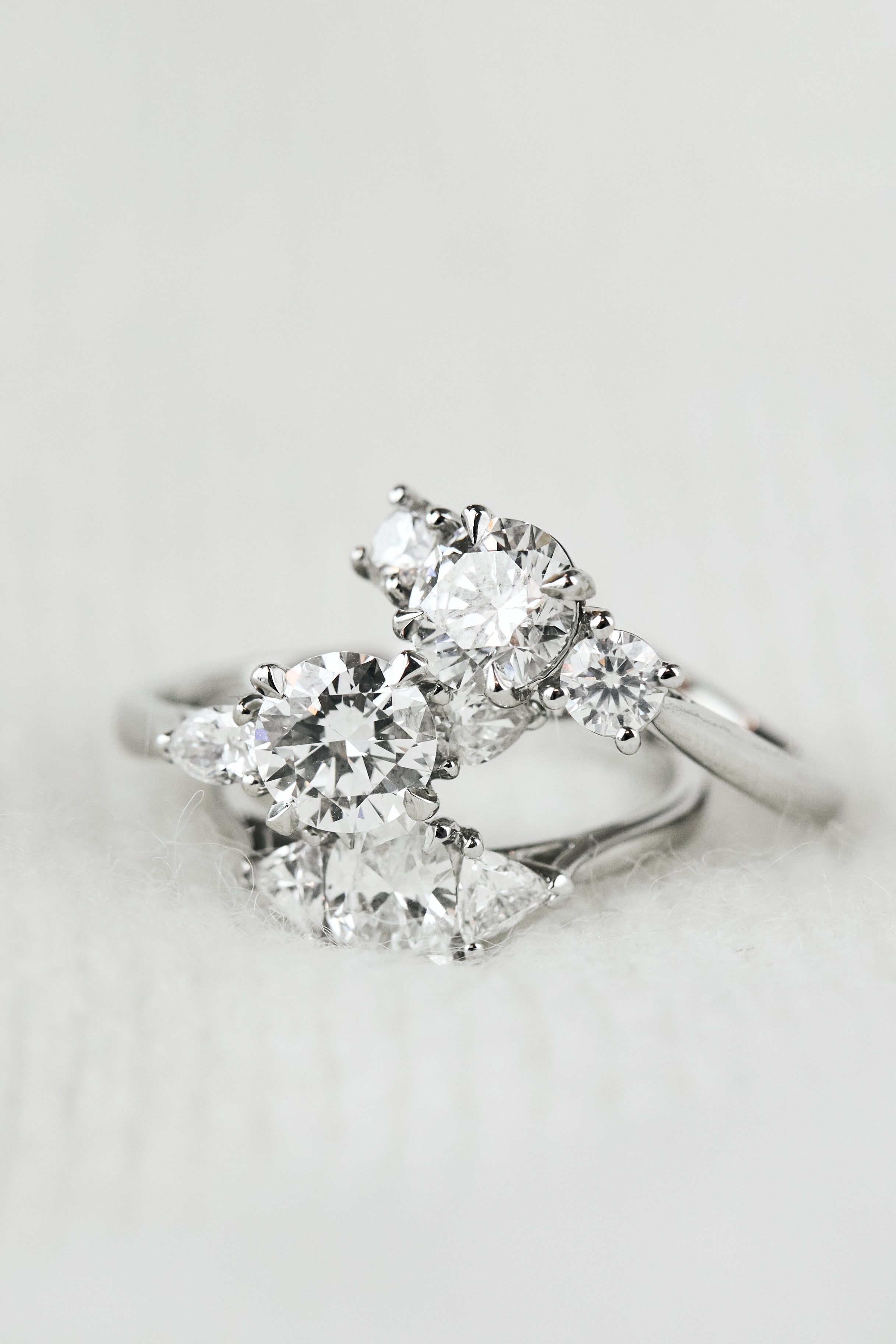 This ethical lab-grown round brilliant cut diamond is celebrated for its sleek curves and timeless brilliance. A pair of matching round side diamonds adds balance and subtle sparkle, while the high setting creates an understated profile. For those who like their jewellery to be modern classics.