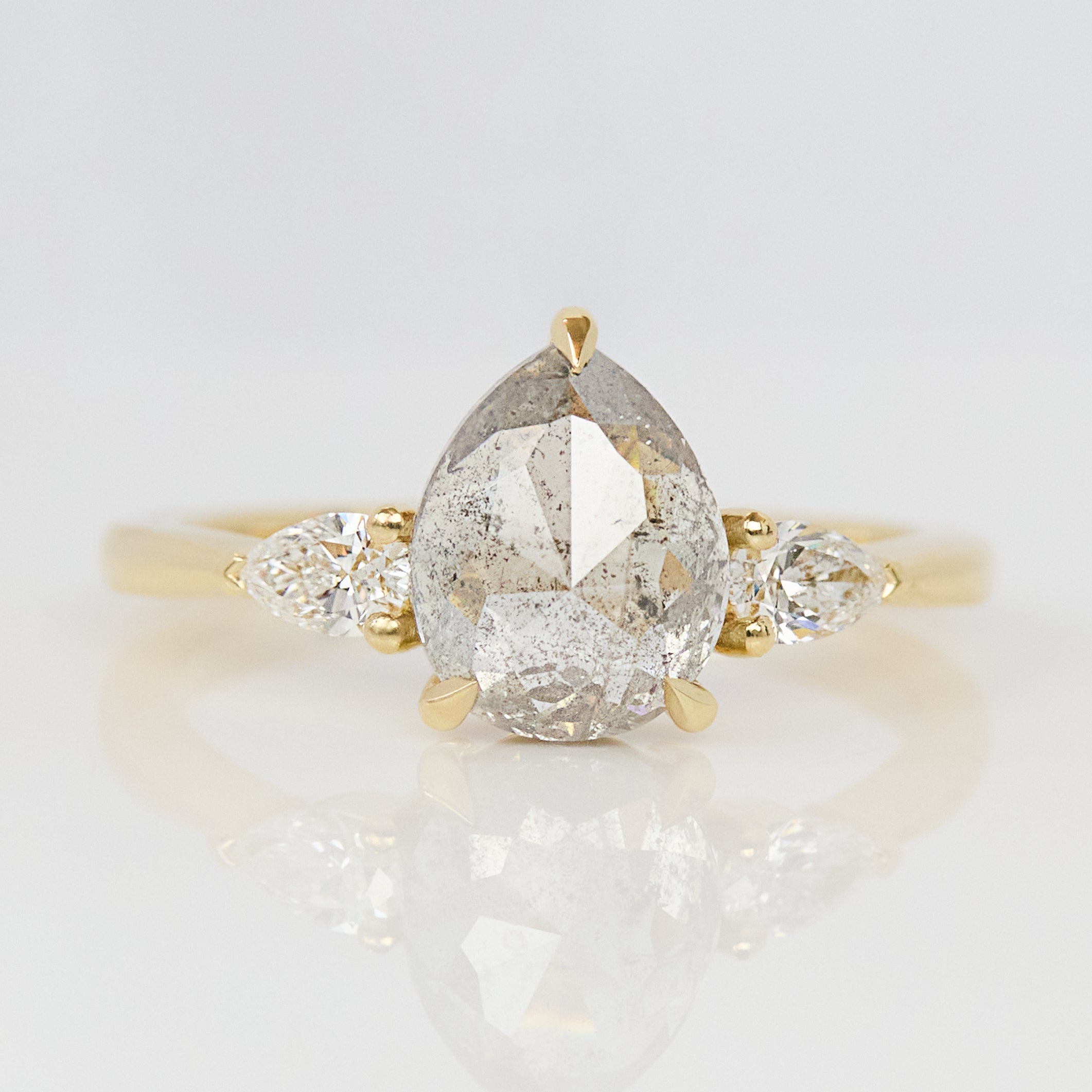 The Luna Ring features a stunning natural pear shape rose cut salt and pepper diamond, complemented by a pair of matching pear shape lab side diamonds. Set in 18ct yellow gold, its sleek, modern design is elevated by the unique trilogy setting, making it a striking and timeless choice for an engagement ring.