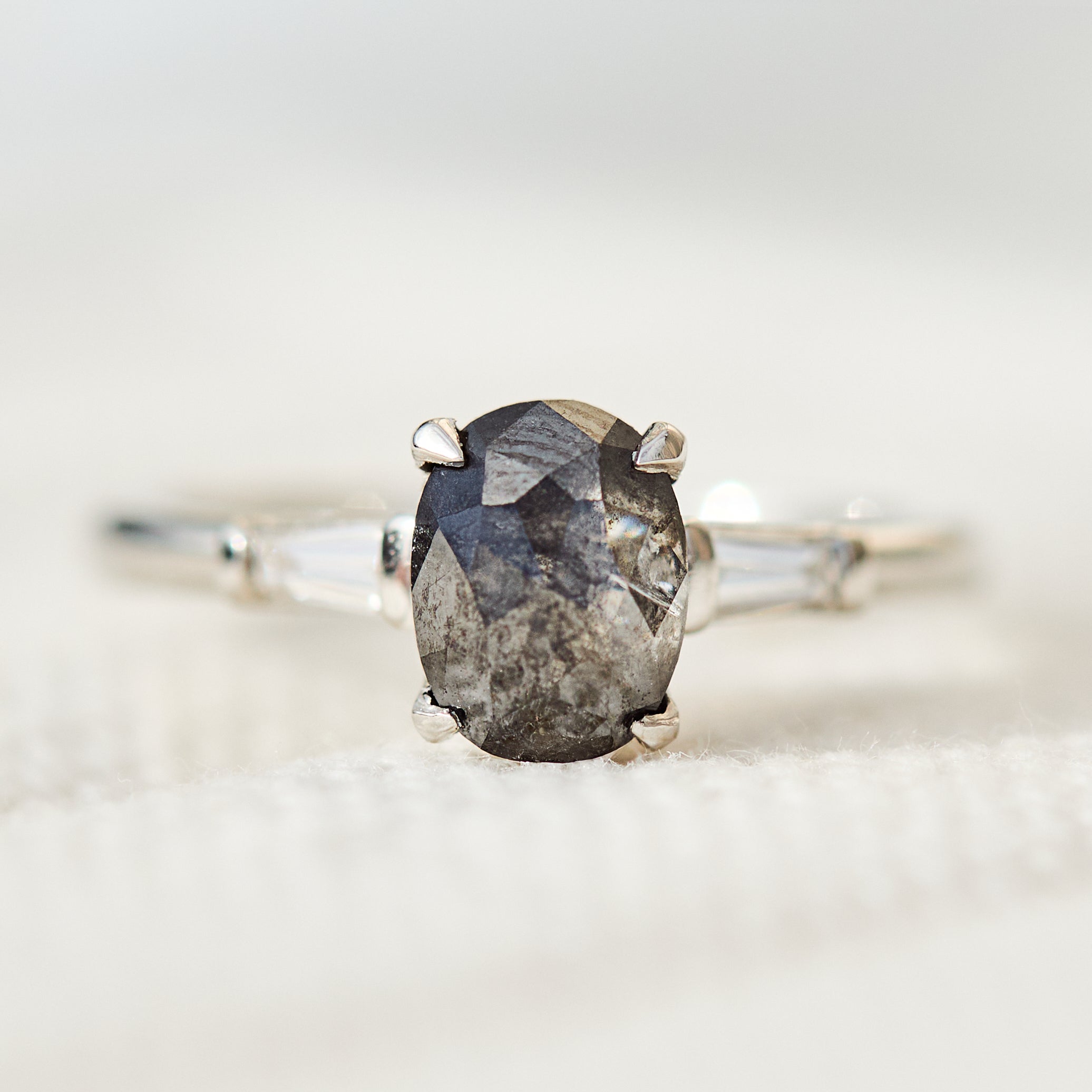 This dark oval rose-cut salt and pepper diamond showcases unique natural inclusions and many facets that create extra sparkle. Tapered baguettes add beautiful lines to the soft curves of the central stone. Giving contrast and a modern feel.