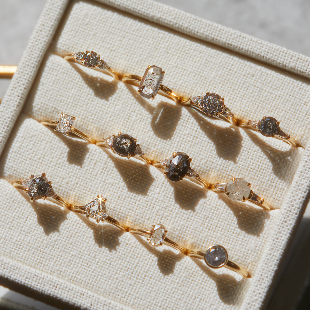 The Luna ring is taken from our collection of one-of-a-kind engagement rings, designed around a beautiful and ethically sourced black salt and pepper diamond hand-selected by Sophia. Framed by matching pear-shaped side diamonds in 18ct yellow gold, it’s a bold yet timeless piece.