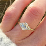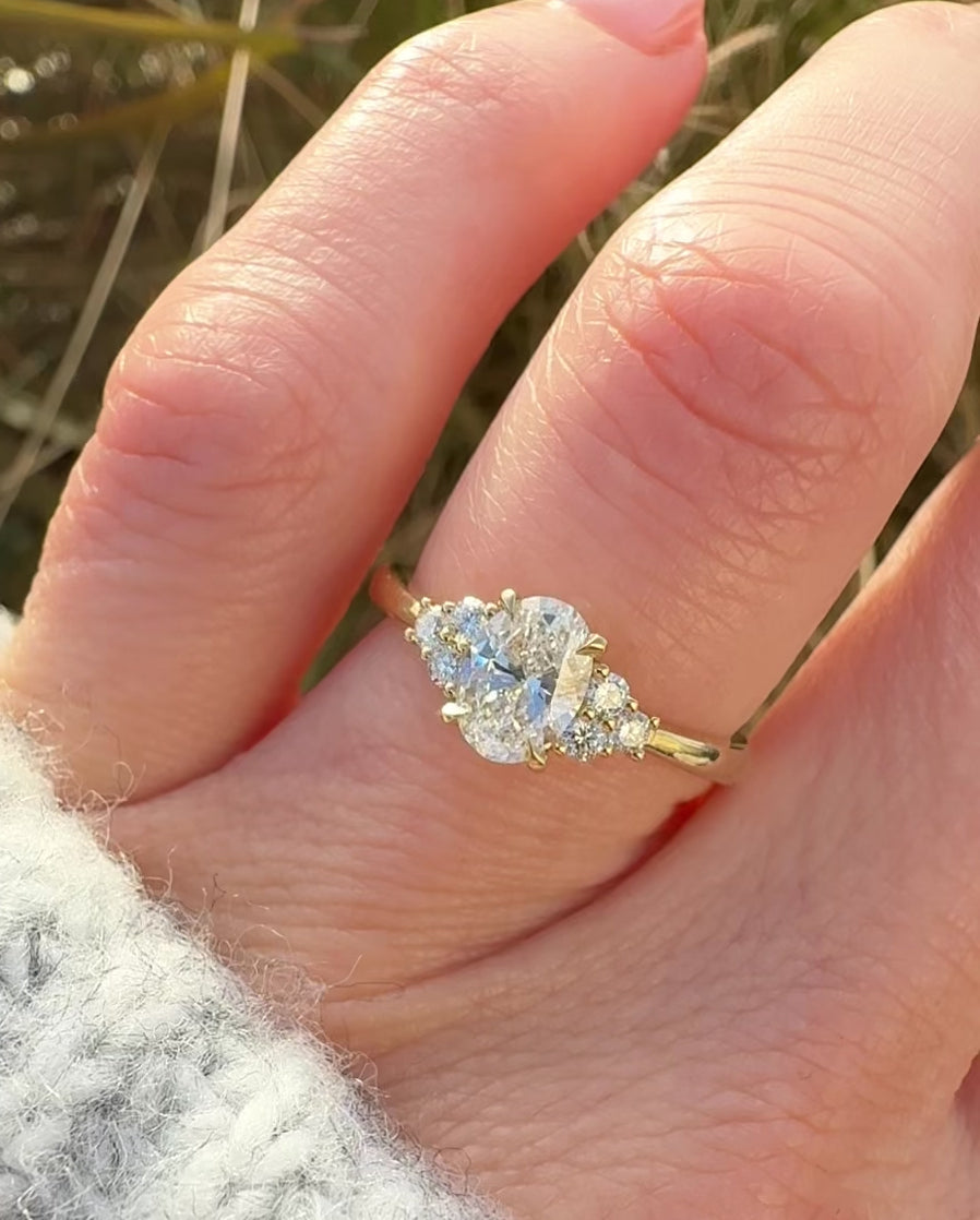 A vintage-inspired design, this Thalia engagement ring features a lab grown oval diamond in a low setting. Accented by six round lab grown diamonds in 18ct yellow gold, it’s a delicate yet distinctive choice.