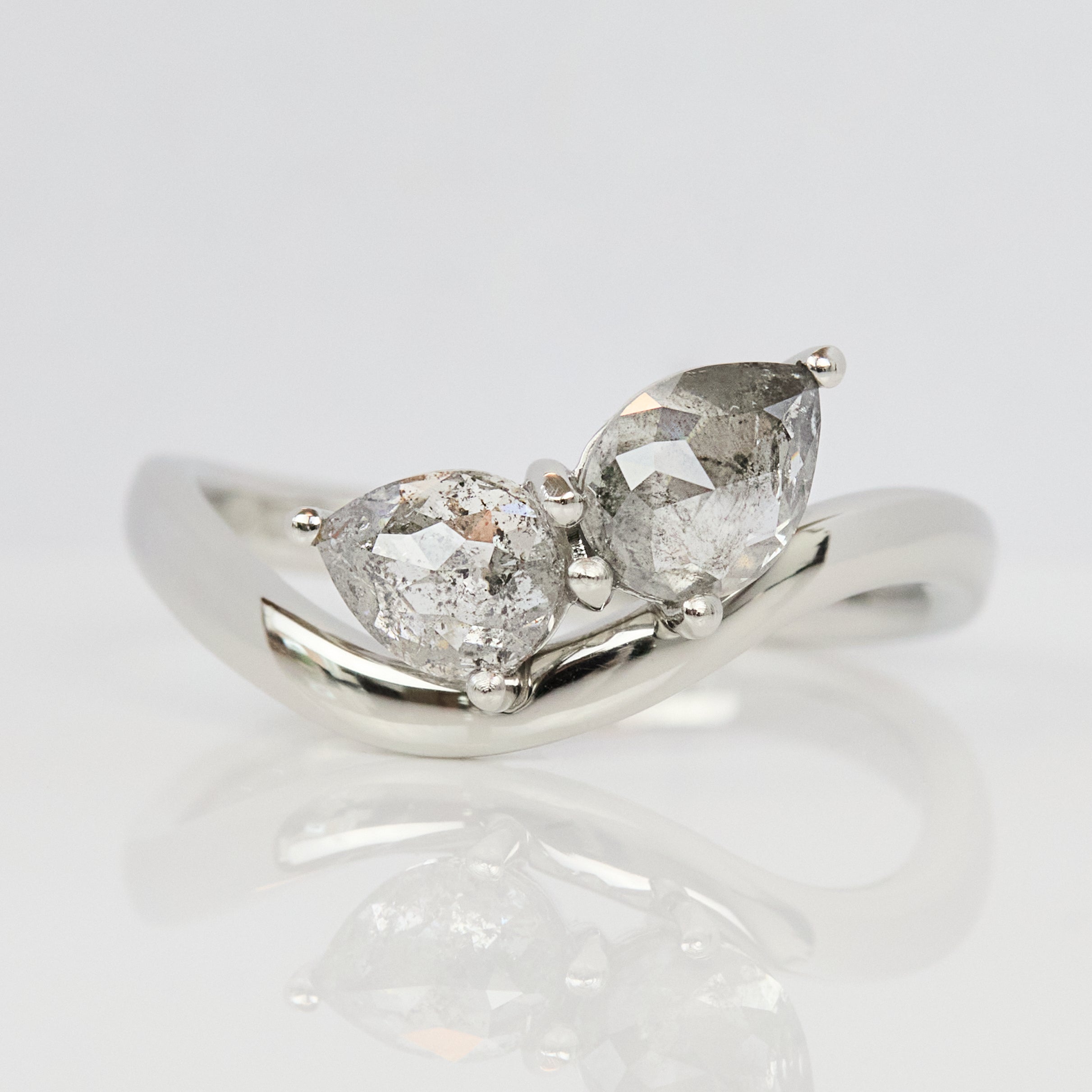 This one-of-a-kind engagement ring features two pear shape, rose cut salt and pepper diamonds. Set in platinum, the clean, unique design creates a sophisticated, modern silhouette.
