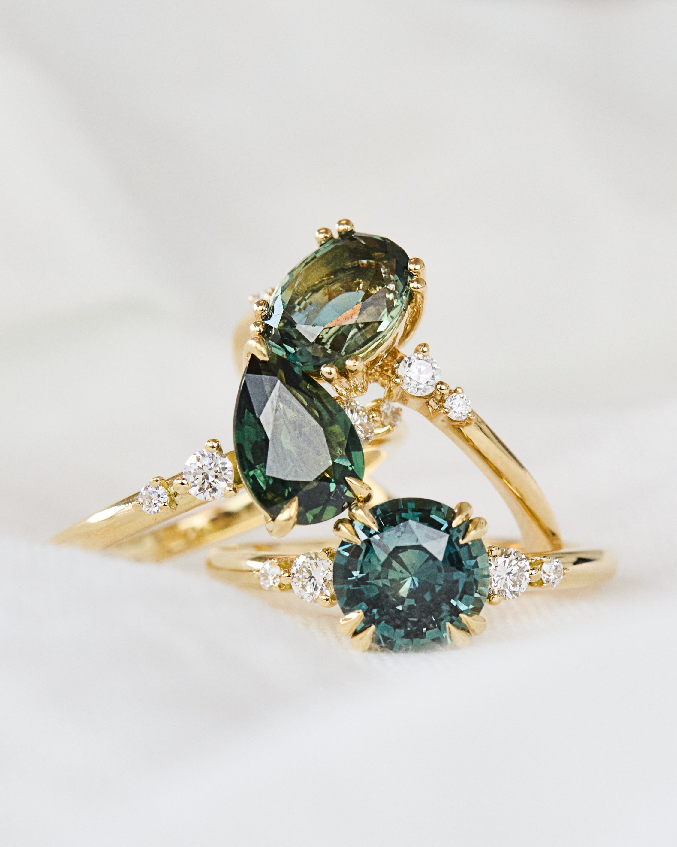 This beautiful oval teal Montana sapphire was chosen for its brilliant sparkle and timeless charm. Graduating side stones add a delicate touch, while double claws secure the centre stone, offering a unique and modern detail.