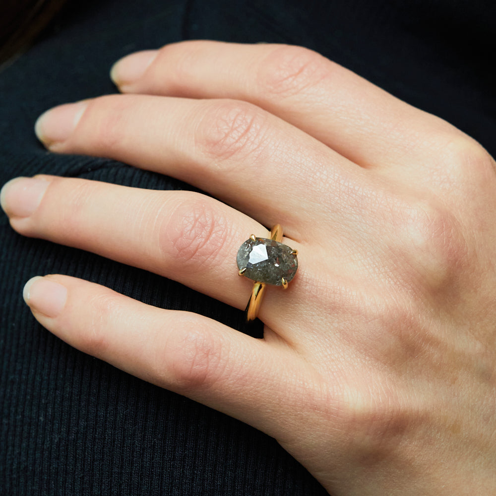 A design with clean, refined curves, this Juno engagement ring features a grey salt and pepper oval rose-cut diamond. Set in 18ct yellow gold, it’s simple yet striking.