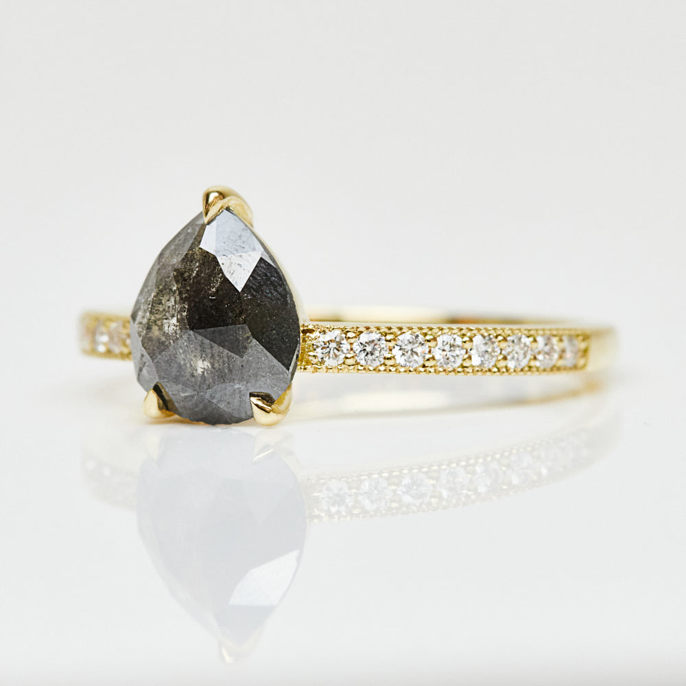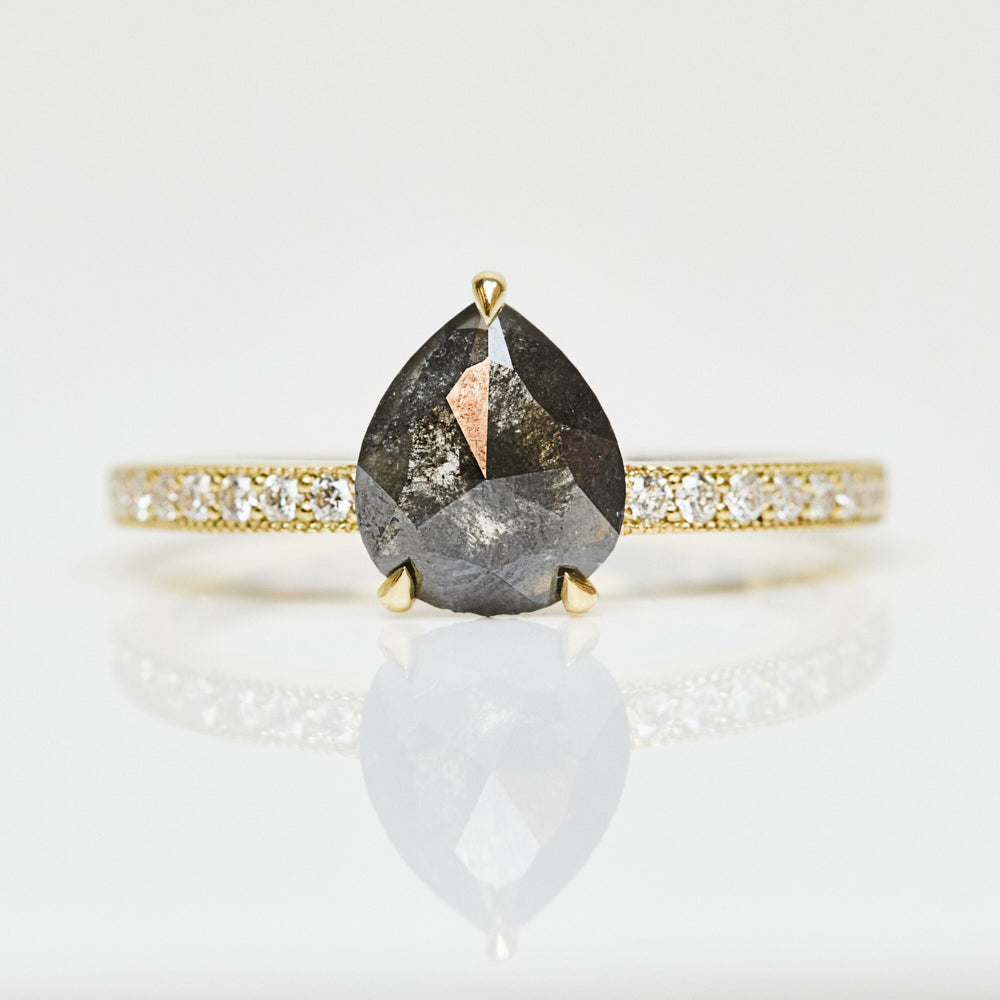 From our Athena collection, this beautiful engagement ring features a pear rose cut black diamond. Pavé-set diamonds along the band add extra sparkle and depth. Trilogy engagement rings represent the past, present, and future. The perfect choice for your forever ring.