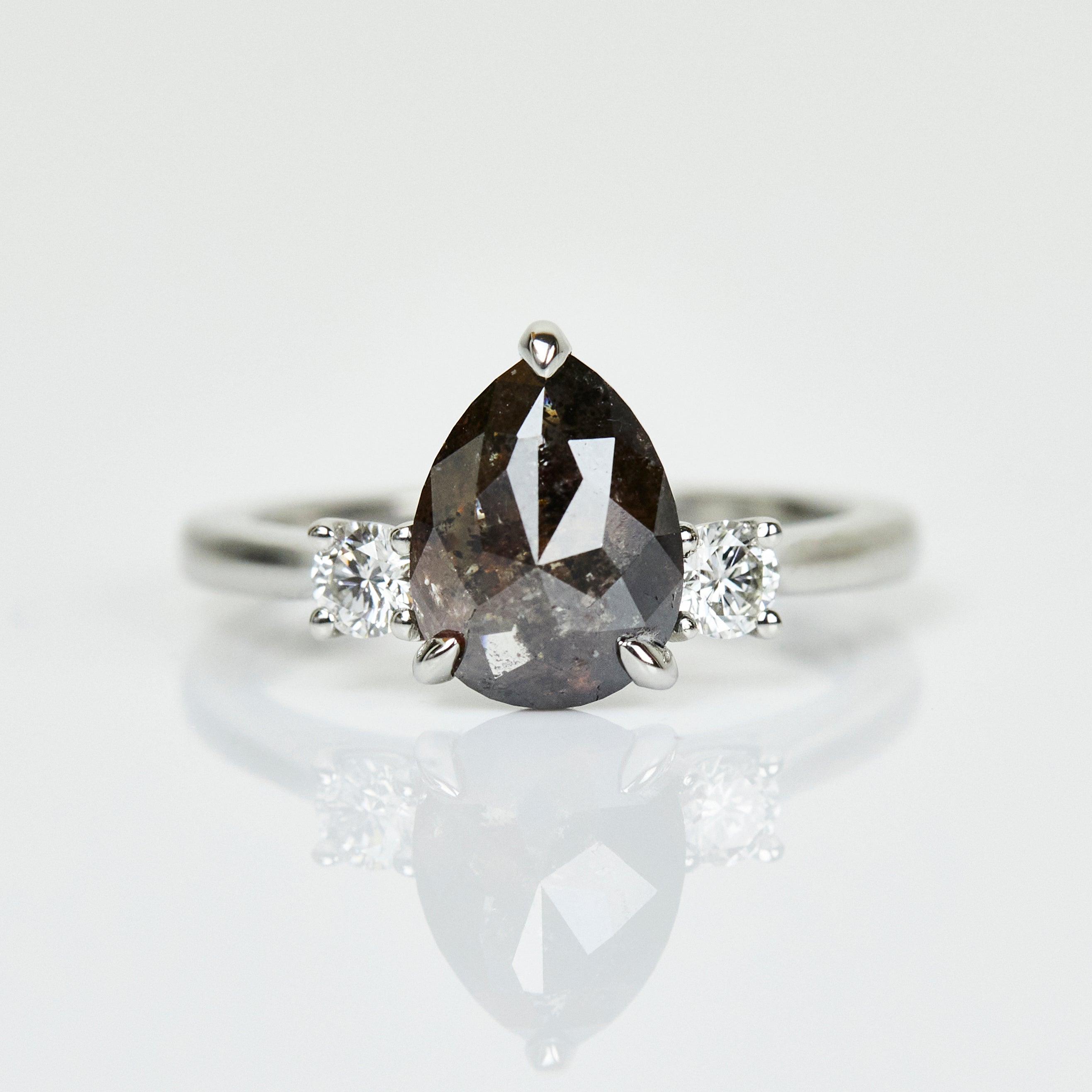 One of our Art Deco–inspired engagement rings, this Aphrodite ring features a central pear shape rose-cut black salt and pepper diamond, framed by two round side diamonds for added brilliance. Set in platinum, it’s a distinctive engagement ring for lovers of alternative jewellery.