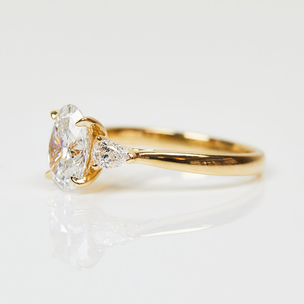 The Luna ring is an SPJ favourite. This engagement ring features a stunning lab-grown oval diamond, complemented by two pear-shaped side diamonds. Handcrafted in 18ct yellow gold, it is elegant simplicity at its best.
