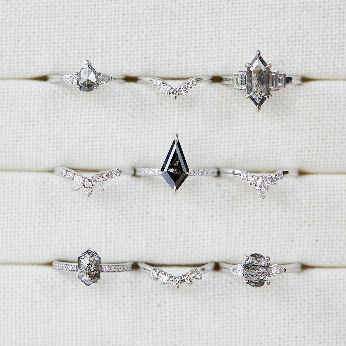 Proof that minimal needn’t be boring, the Athena engagement ring features a striking kite-shaped dark salt and pepper diamond, accented by round side diamonds. Set in platinum, it’s a bold yet refined design.