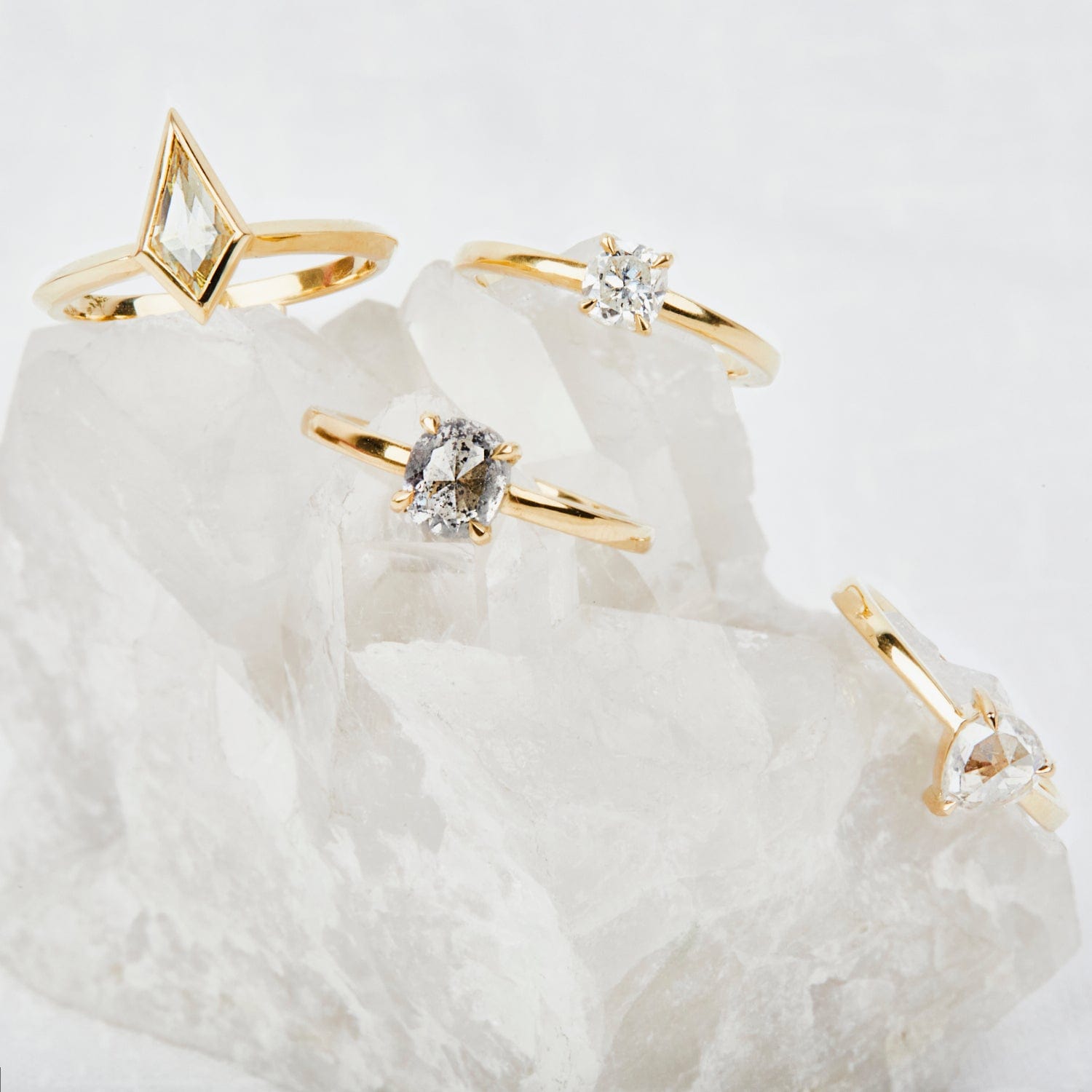 Subtle design details make this Juno engagement ring the perfect choice for someone seeking a round rose cut salt and pepper solitaire with a twist. The 9ct yellow gold setting lends it a slight vintage feel, yet its pared-down design is unmistakably modern.
