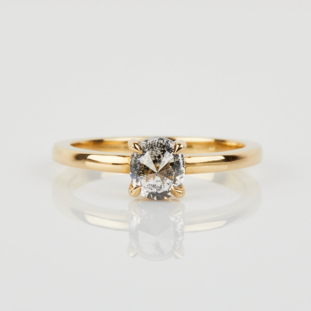 For those who love the alternative look of a grey salt and pepper diamond and want something a bit bolder than a classic solitaire, this one-of-a-kind ring features a round rose cut central stone. A beautiful, clean design with a whole lot of personality.