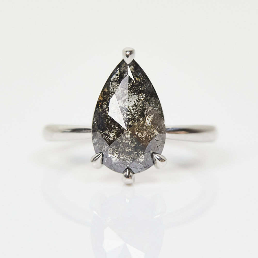 The combination of the central pear shape black salt and pepper diamond with its refined Juno solitaire setting gives this engagement ring a unique look, while the elegant Platinum setting keeps it modern and timeless.