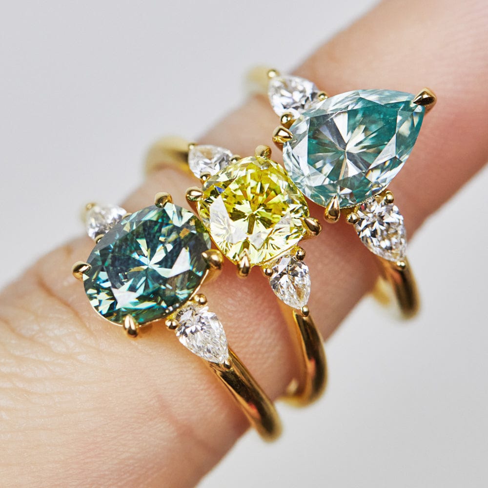 An elegant and feminine piece, the Luna engagement ring features a cushion-cut yellow lab-grown diamond framed by matching pear-shaped side diamonds. Set in 18ct yellow gold, its refined proportions create a truly harmonious design.