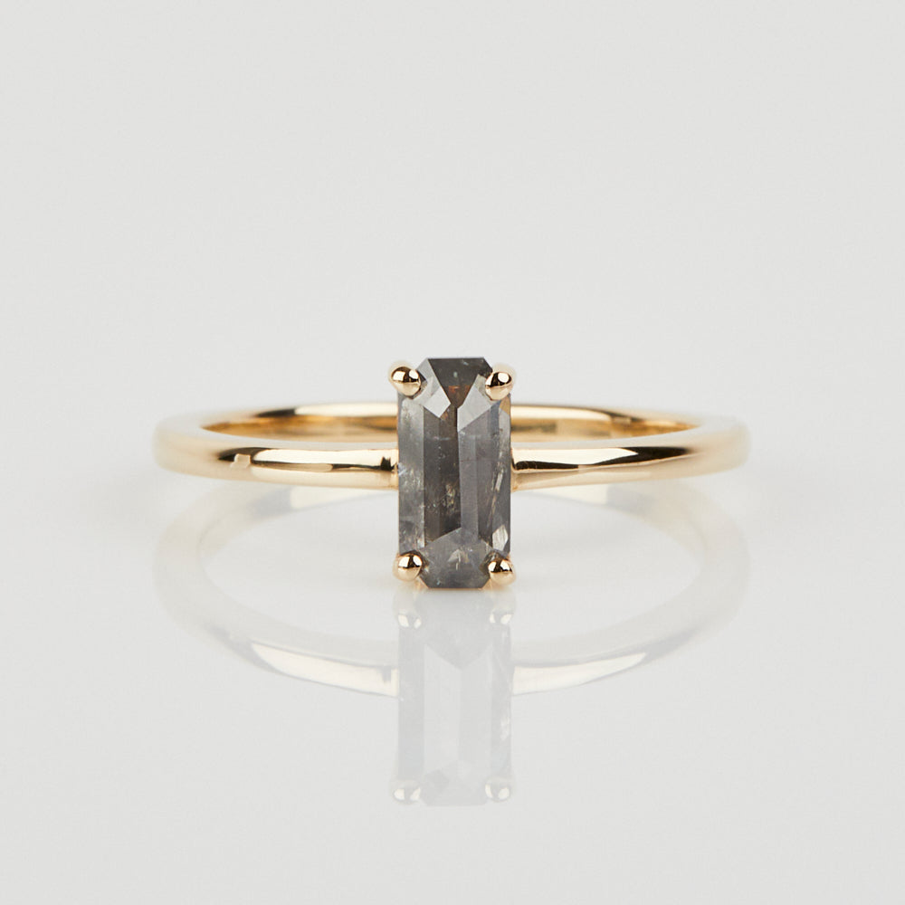 A captivating solitaire, this Juno ring showcases a stunning grey salt and pepper emerald cut diamond. Set in 9ct yellow gold with four claws, this one-of-a-kind design beautifully combines bold colour with refined elegance.