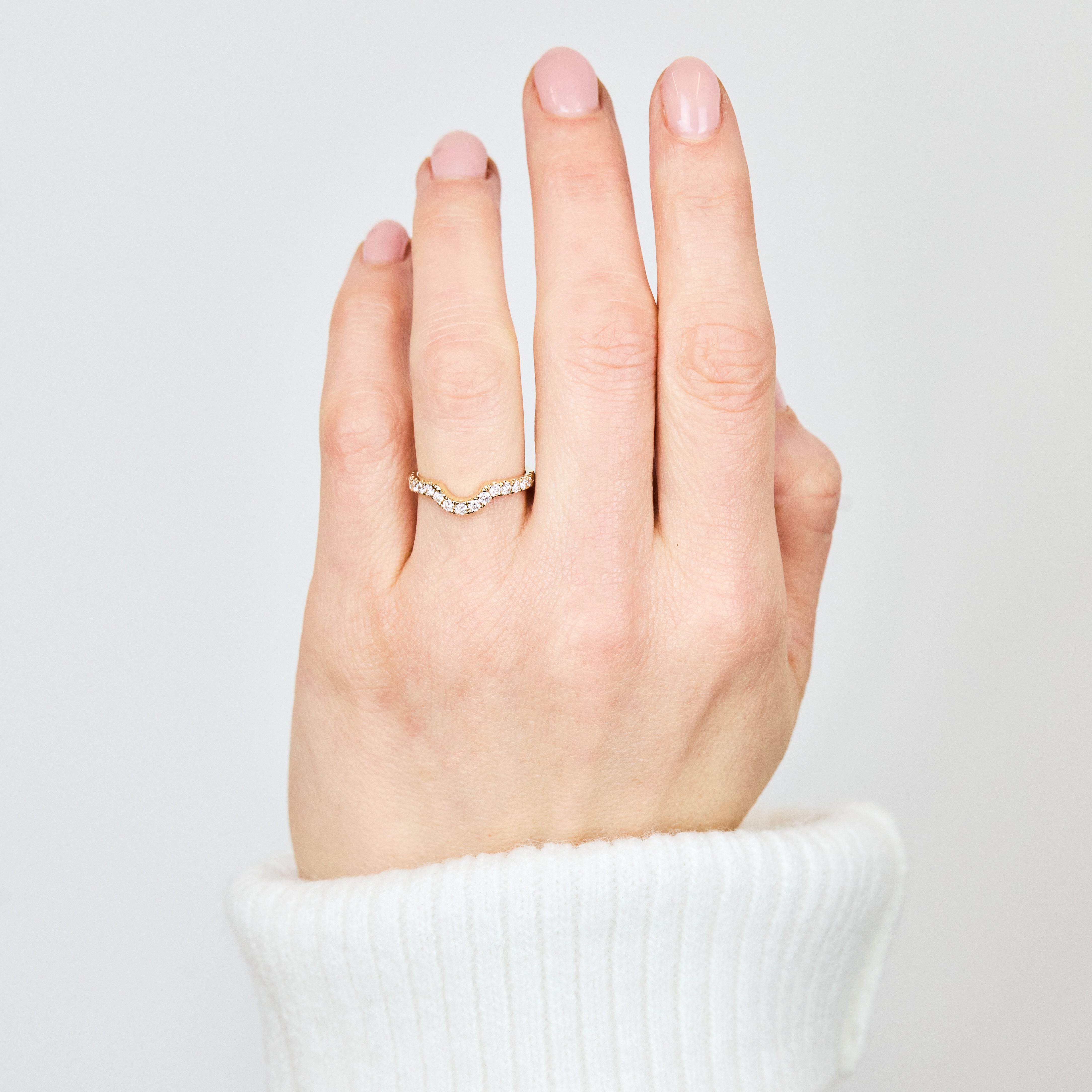 The Bea diamond wedding band is a simple and elegant piece to underline and echo the profile of your SPJ engagement ring, set with eighteen round diamonds in 18ct yellow gold for a bit of extra flair.