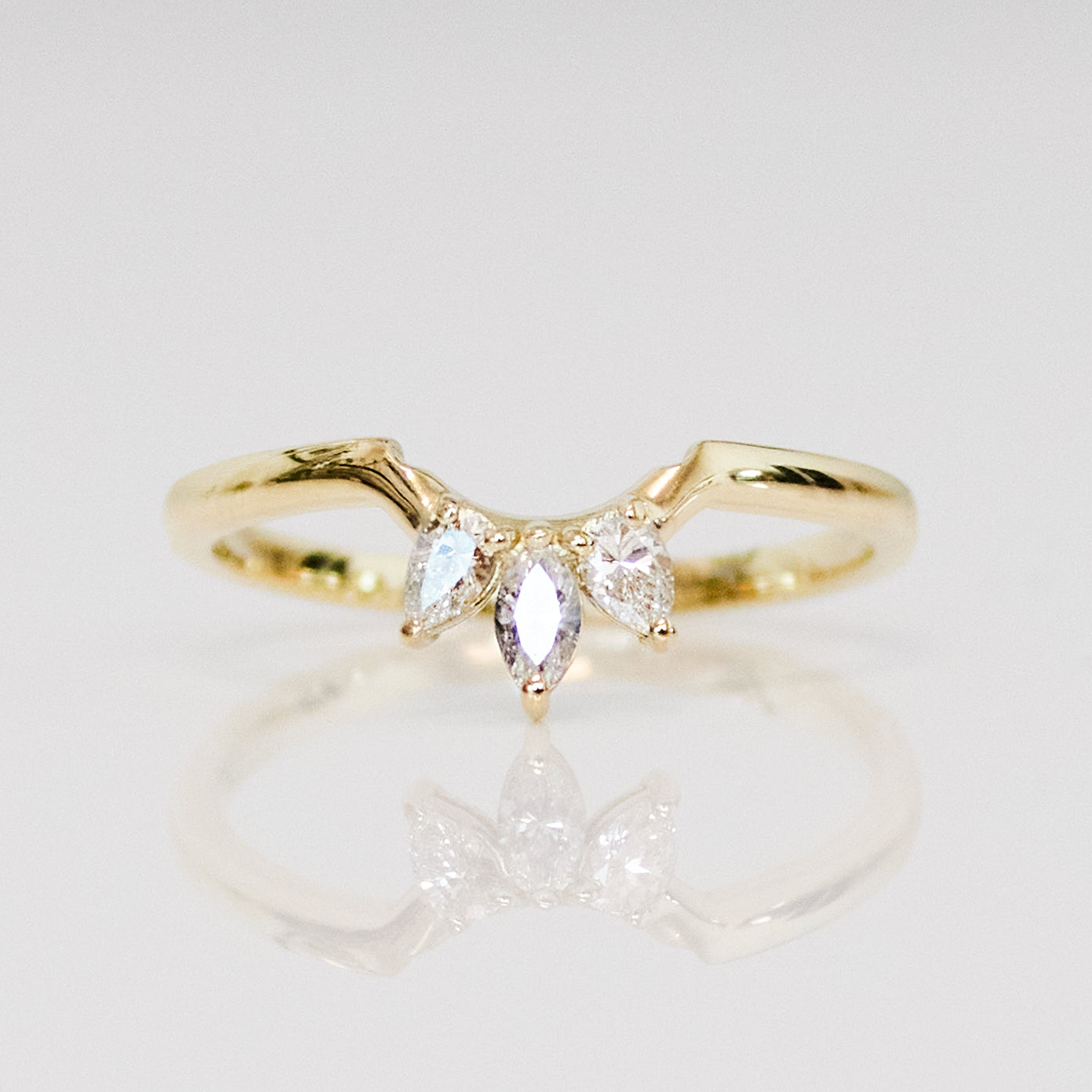 Marquise and a pair of round lab grown diamonds, set along the 18ct yellow gold band of the Flora wedding ring, are curved to beautifully frame a low-set engagement ring or rounder central stone. This alternative piece is wonderful worn on its own as well: a one of a kind wedding band.