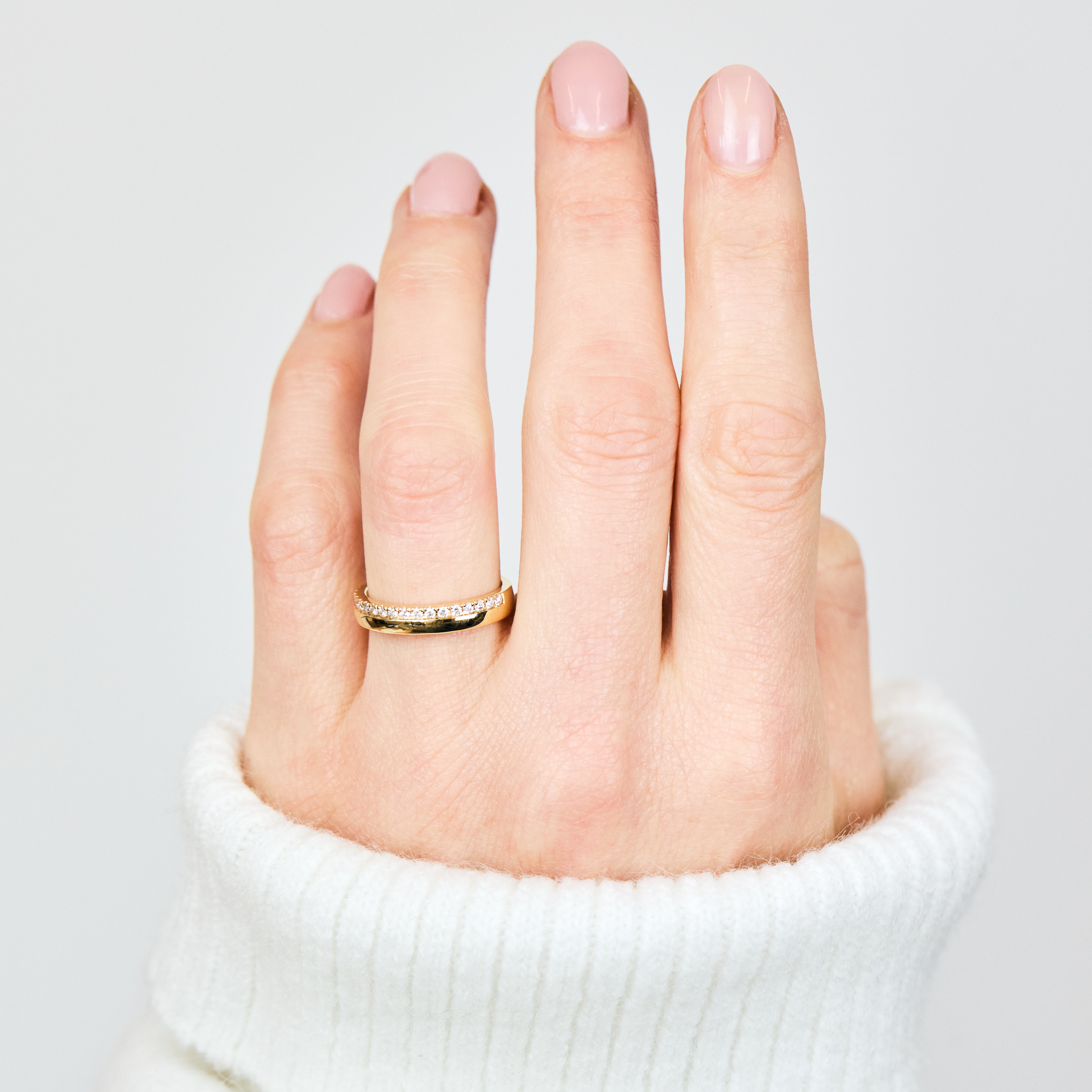 The Katrina diamond wedding band is a simple and elegant piece to underline and echo the profile of your SPJ engagement ring, set with twenty four round diamonds in 18ct yellow gold for a bit of extra flair.