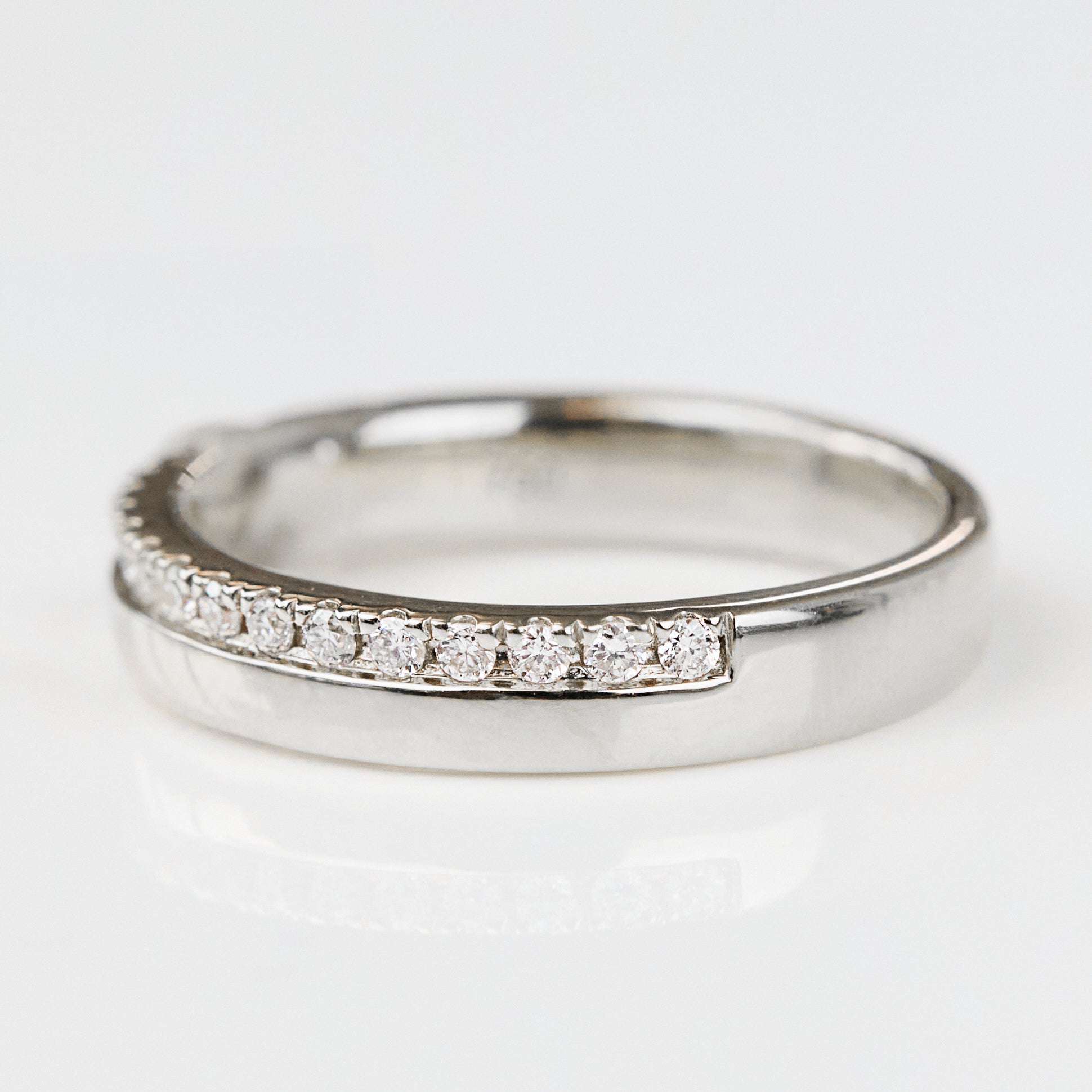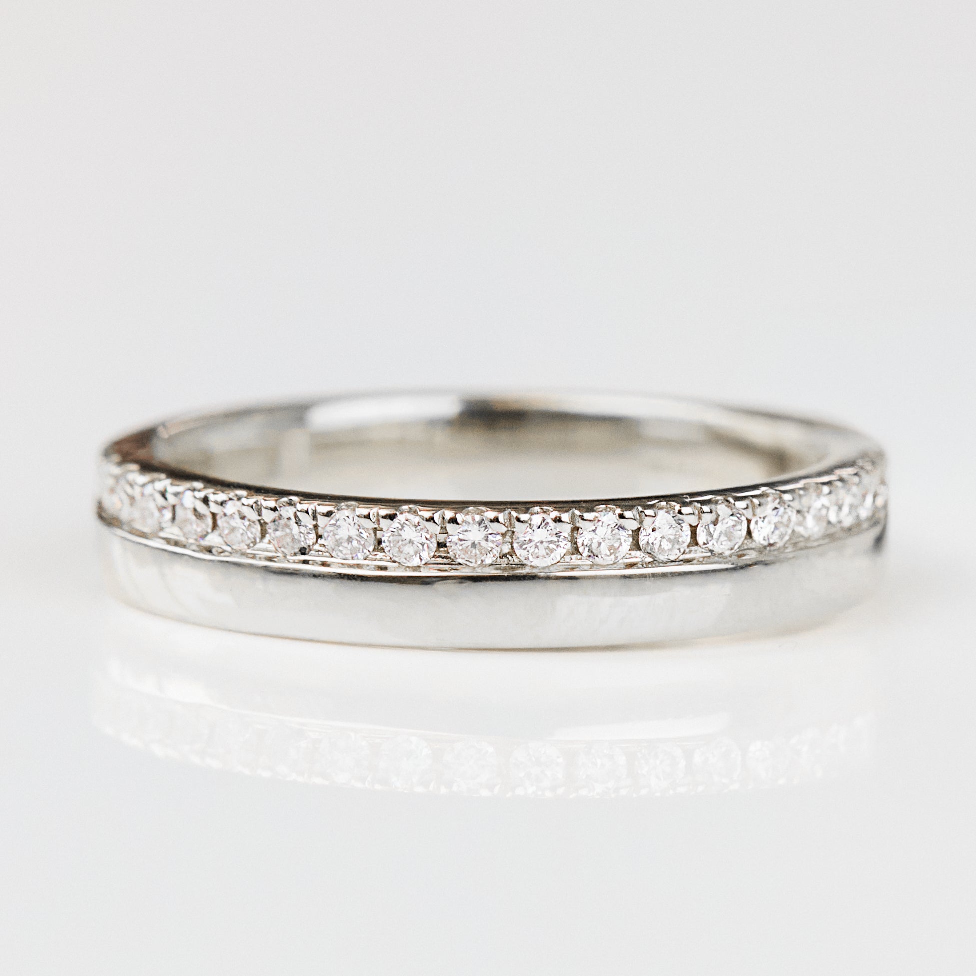 The Katrina diamond wedding band is a simple and elegant piece to underline and echo the profile of your SPJ engagement ring, set with twenty four round diamonds in platinum for a bit of extra flair.