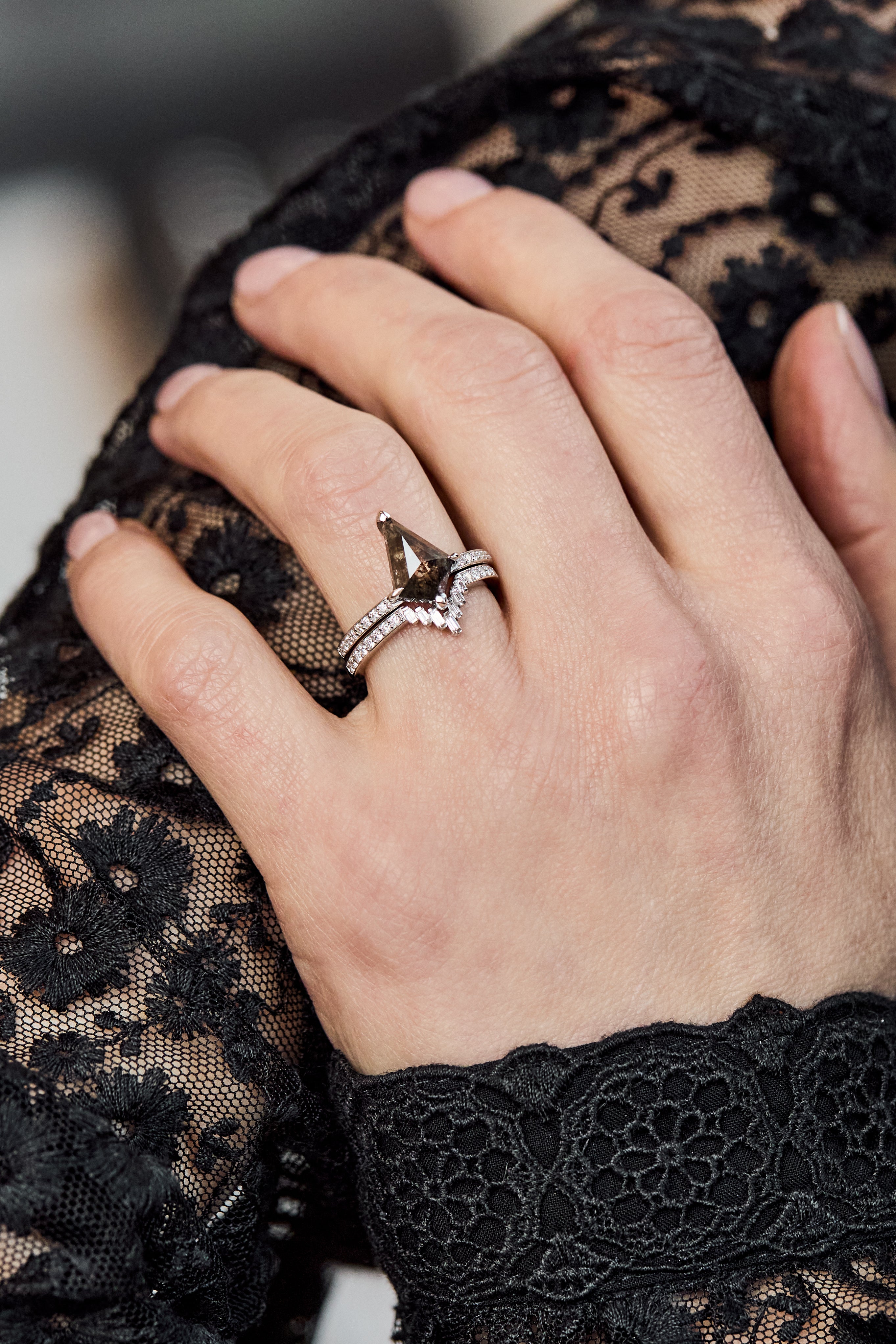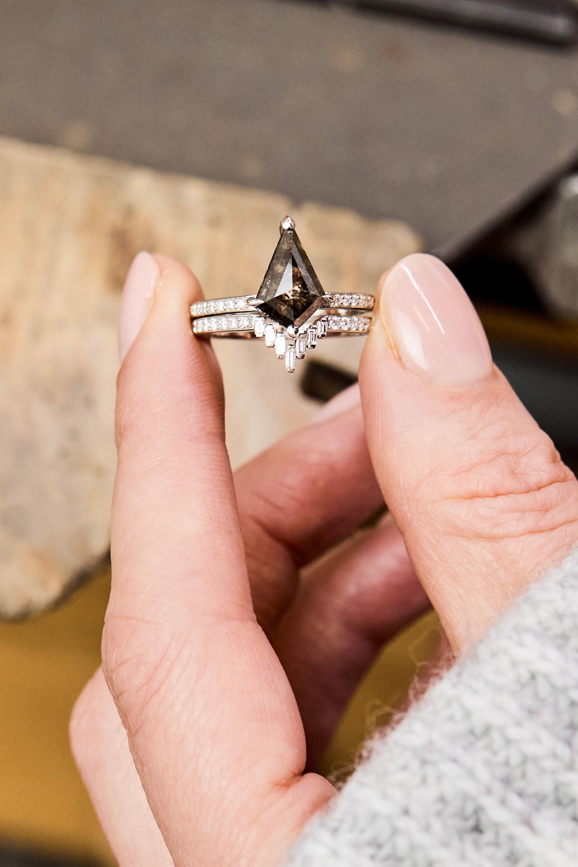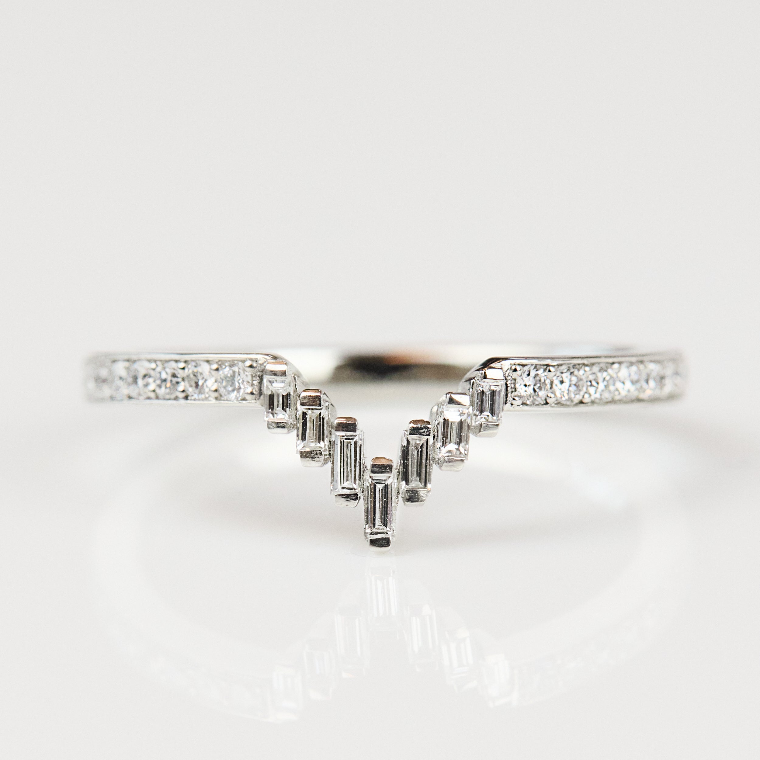 The Leona diamond wedding ring is perfect for accommodating an engagement ring with a kite shape central stone, and it looks wonderful worn on its own too. The pavè diamond shoulders and organic curve created by the seven baguette diamonds add a touch of modernity and feel luxurious in platinum.