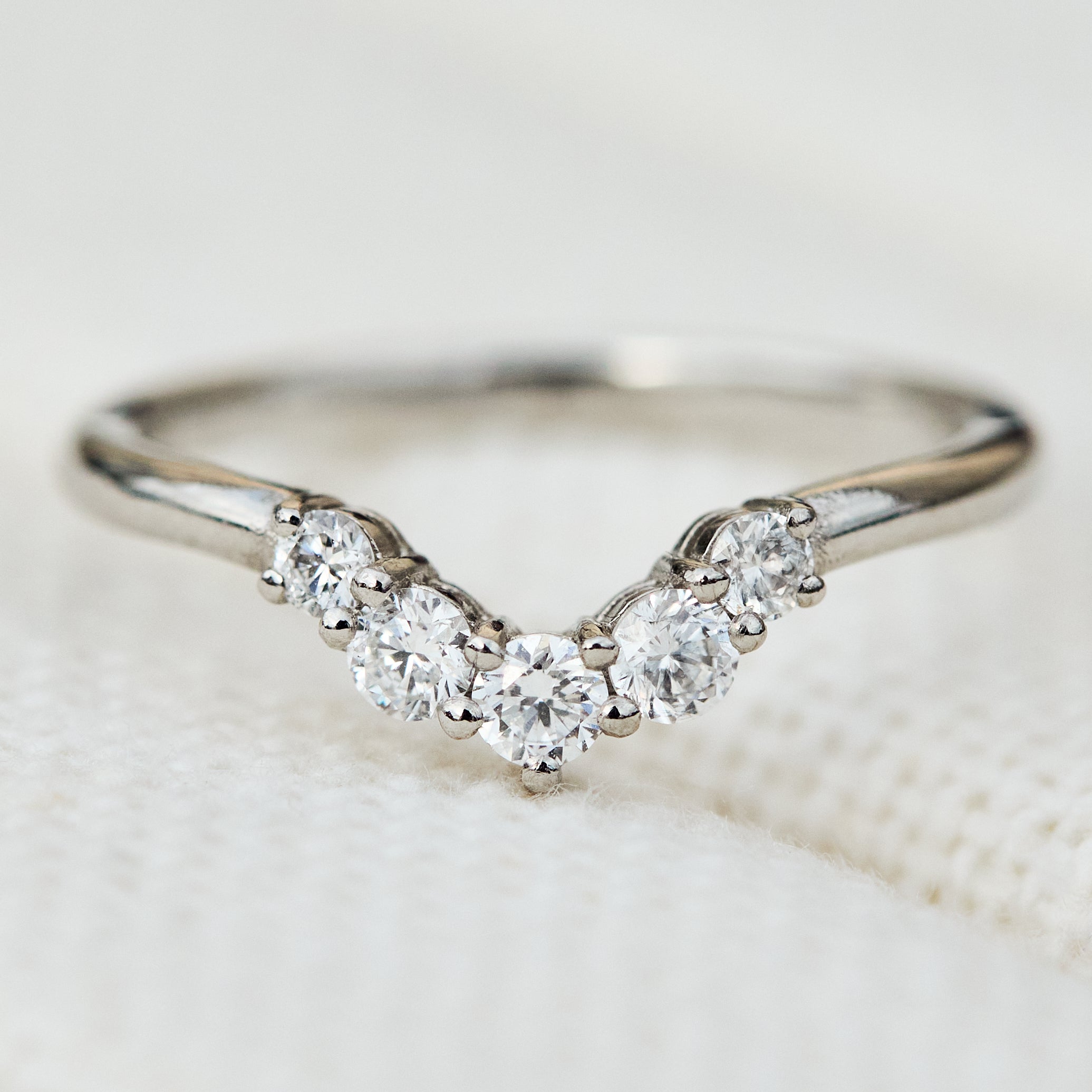 The Mia diamond wedding band has an elegant curve, featuring five round diamonds set in platinum. Perfect to compliment a lower-set engagement ring, as the diamonds will neatly hug and frame the setting.