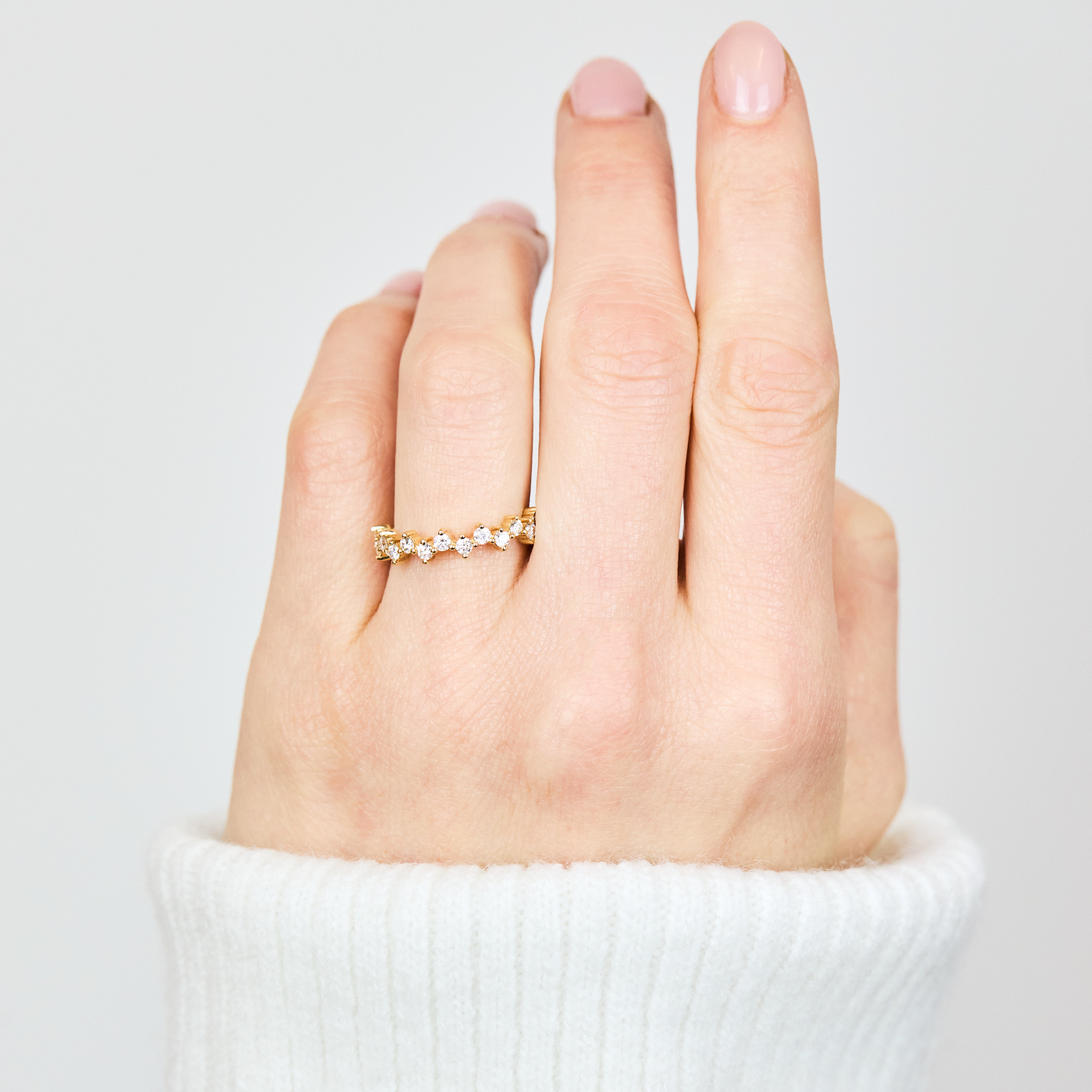 A playful alternative to a more classic diamond wedding band: thirteen round diamonds are set together in 18ct yellow gold to create a beautiful design inspired by nature. For those who like more delicate, ethical pieces that still retain structure and elegance.