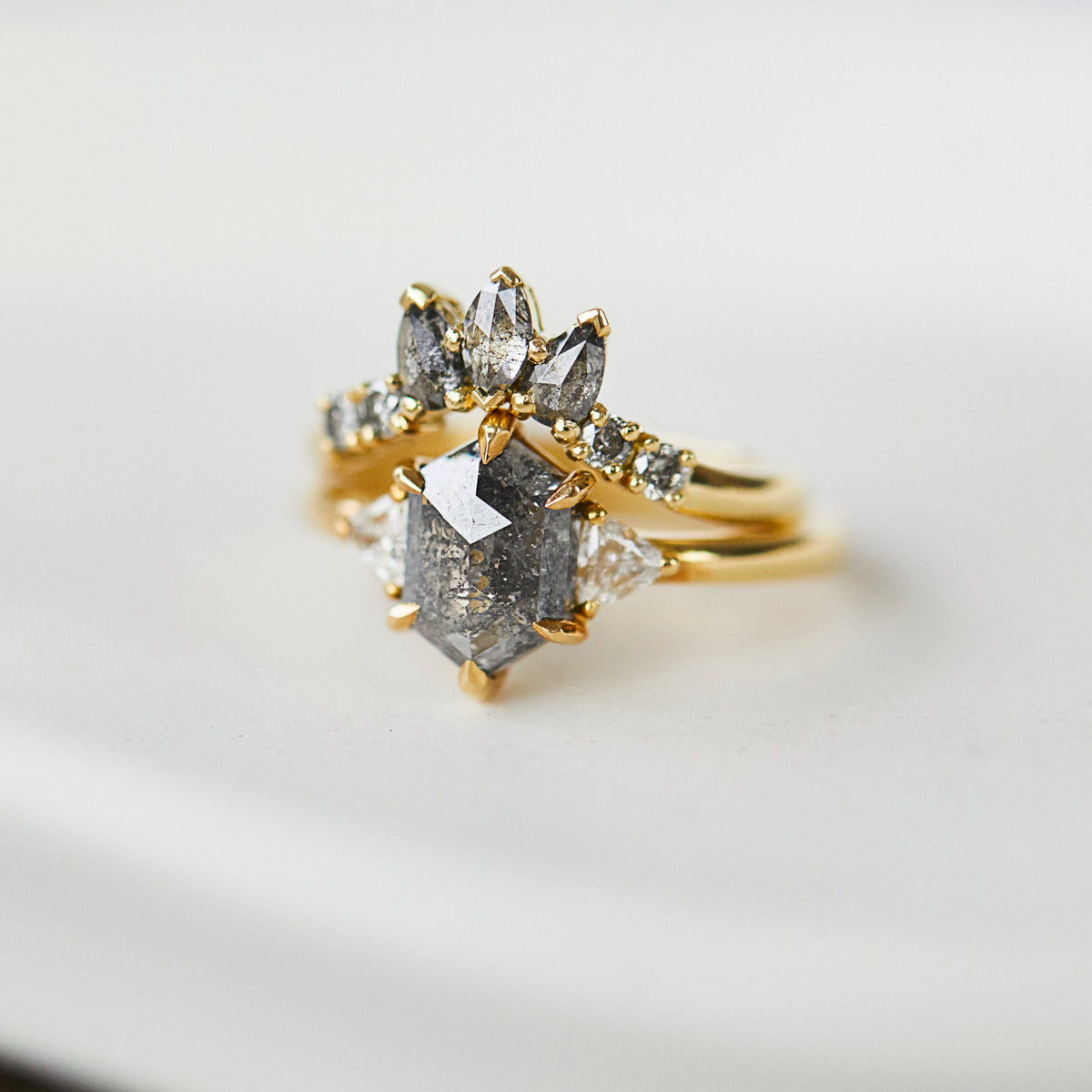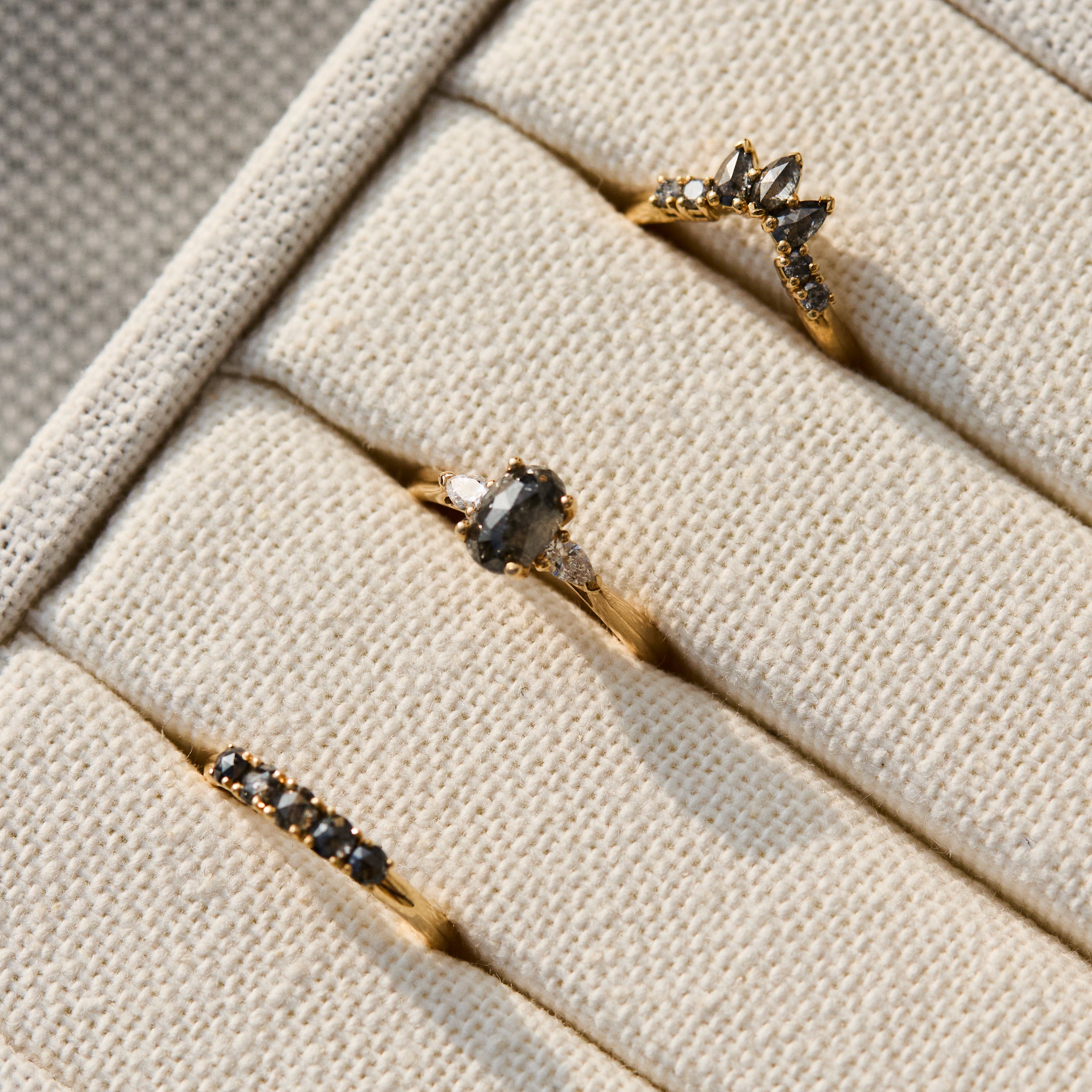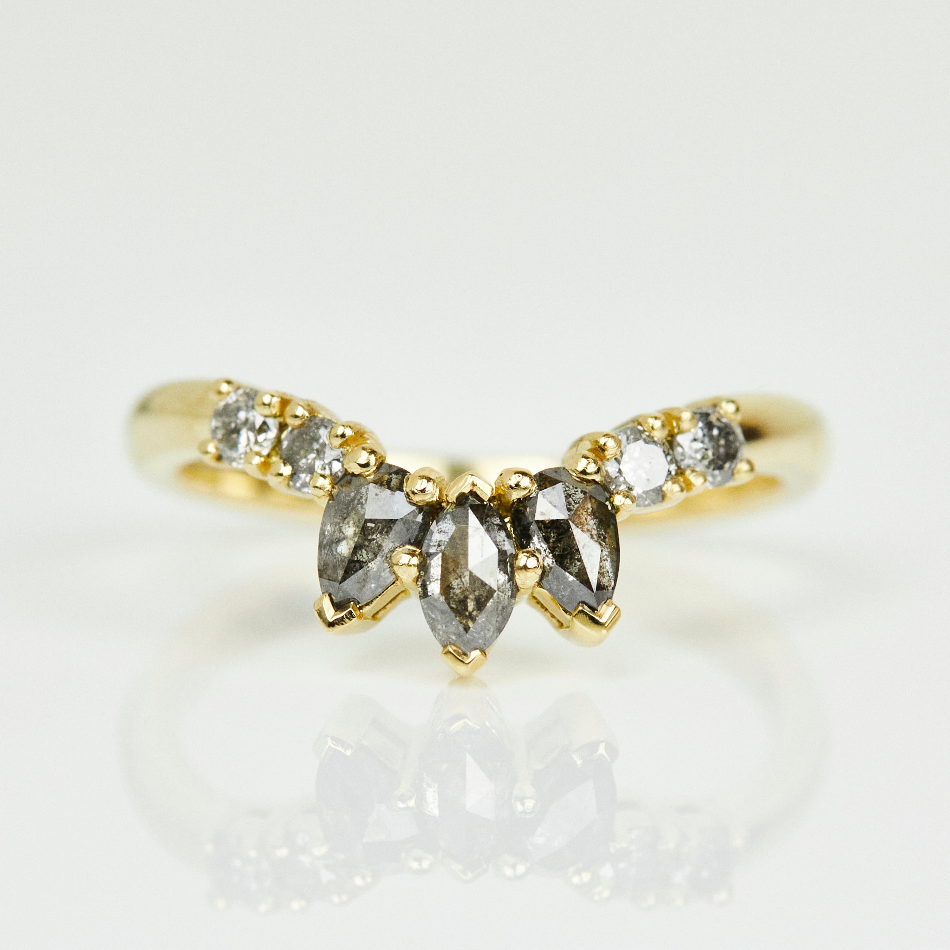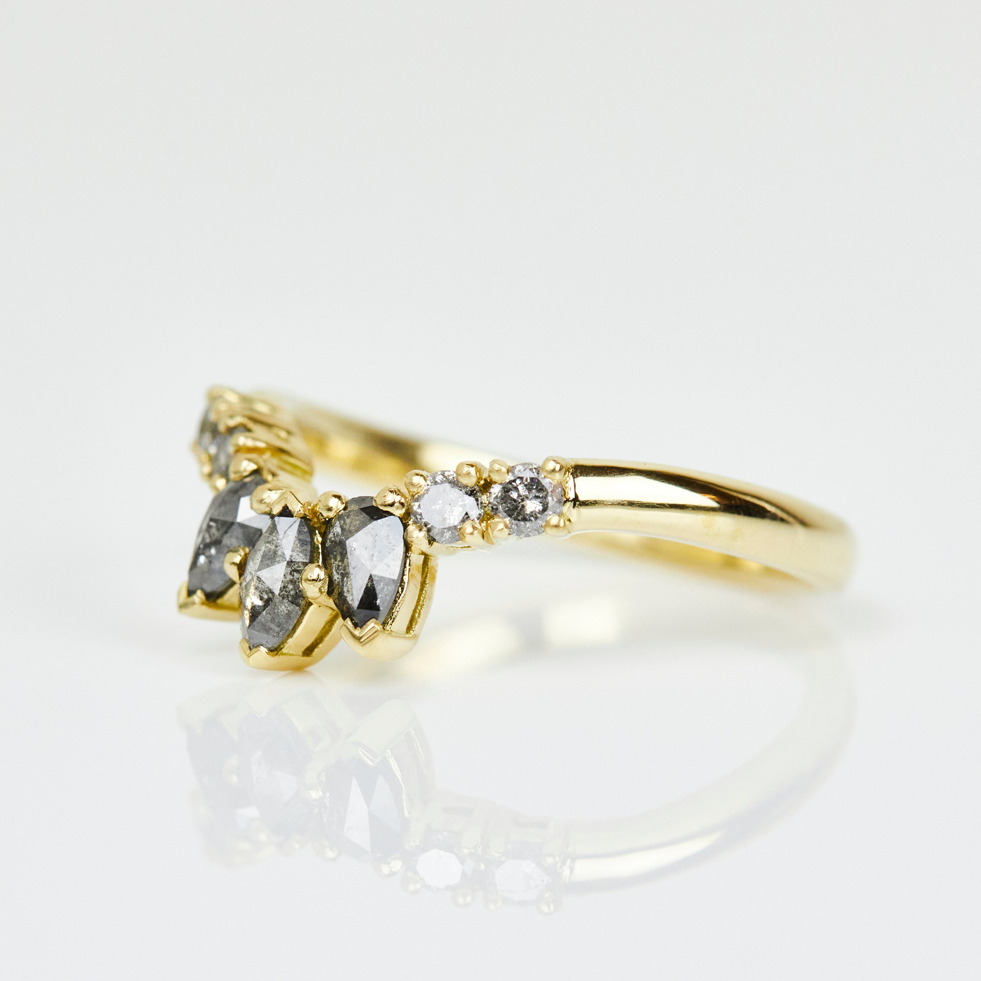 The Seren diamond wedding ring is a unique addition to any bridal stack. The classic 18ct yellow gold setting accents the sleek geometry of the stormy marquise, pear and round brilliant cut diamonds, creating a ring that feels traditional with an alternative twist.