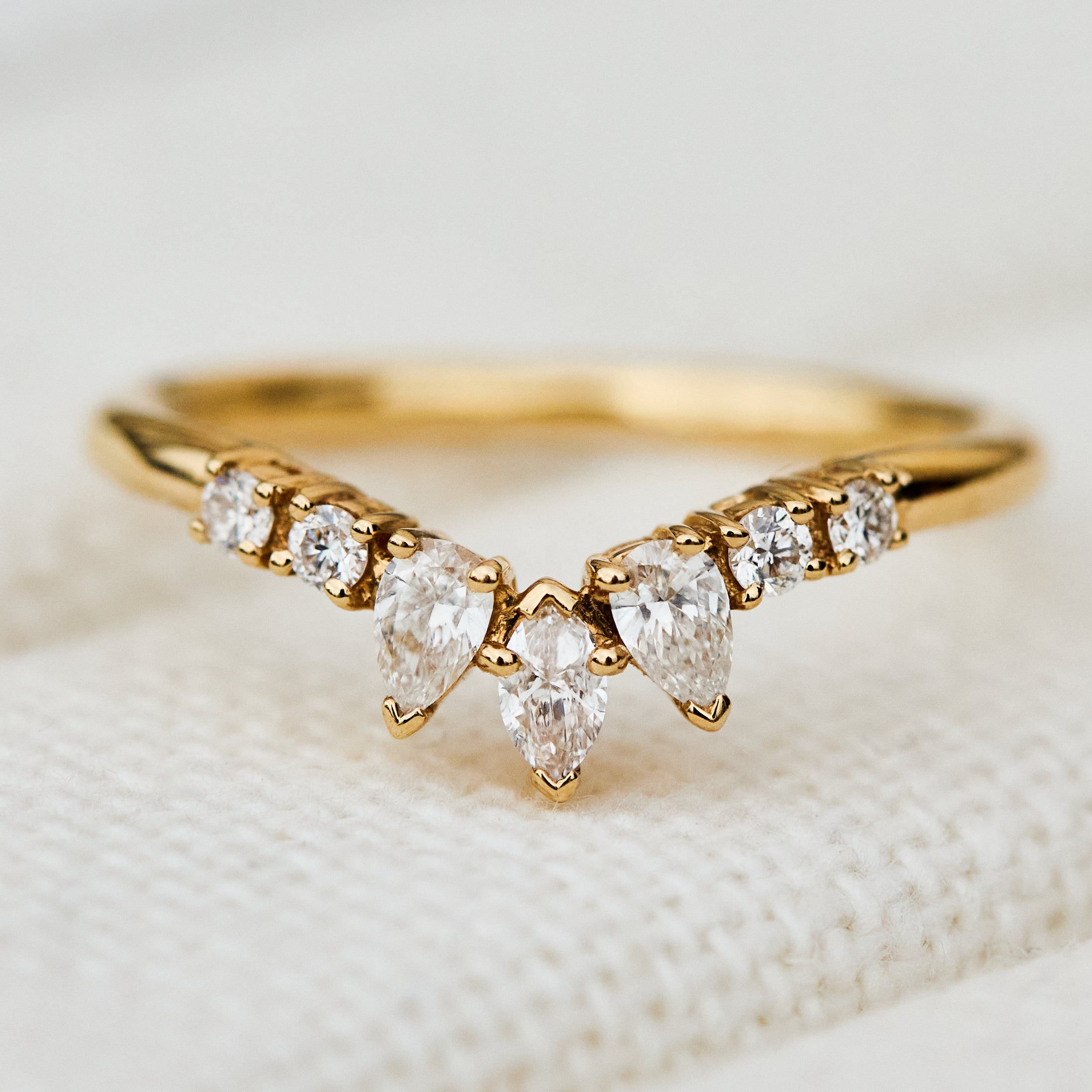 The Seren diamond wedding ring showcases marquise, pear and round cut diamonds set on an elegant 18ct yellow gold band. Our wedding ring collections are available to order in the existing designs or created bespoke. All rings can be made in gold or platinum, and in different widths or finishes.